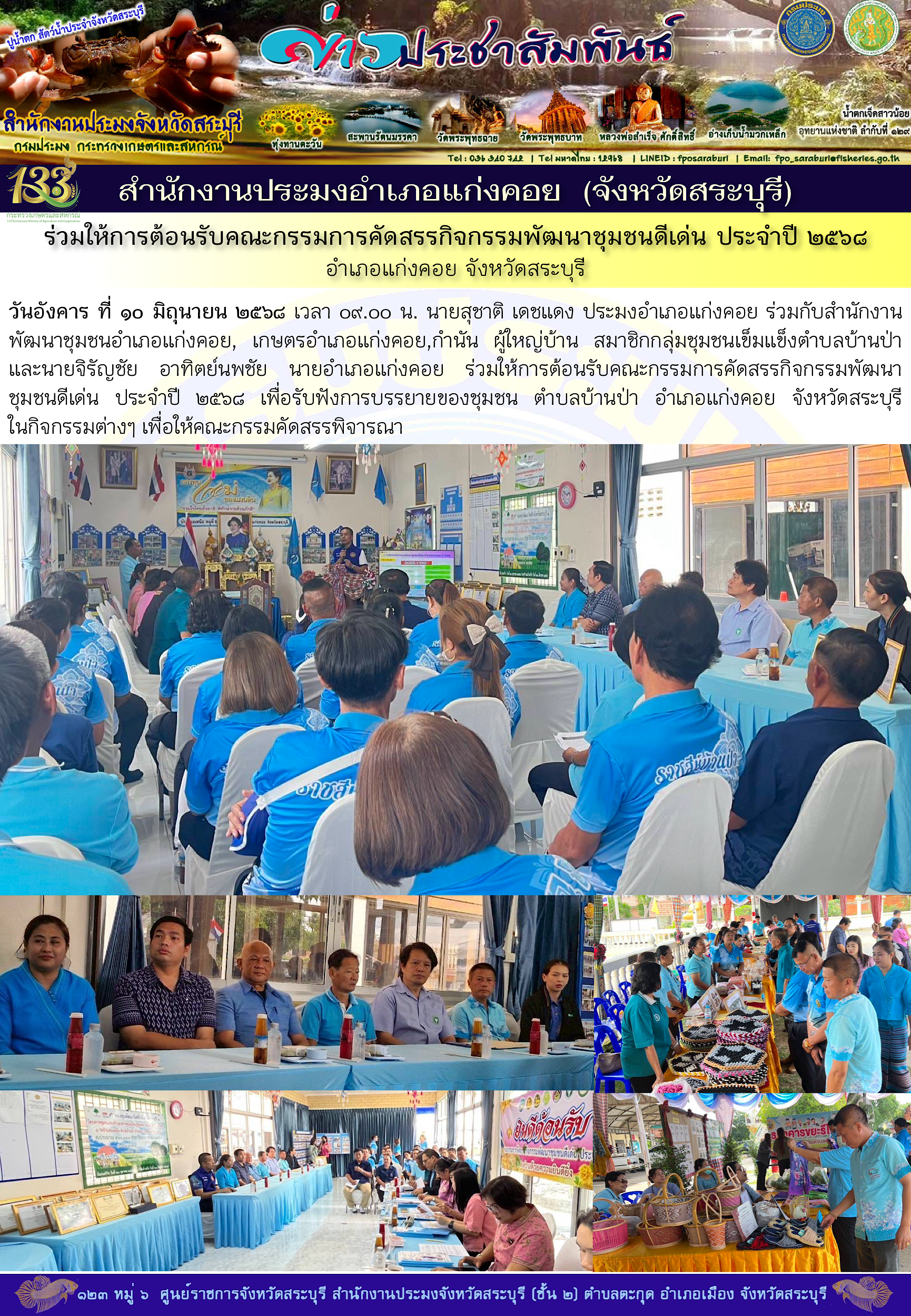 วันอังคาร ที่ ๑๐ มิถุนายน ๒๕๖๘ เวลา ๐๙.๐๐ น. นายสุชาติ เดชแดง ประมงอำเภอแก่งคอย ร่วมกับสำนักงานพัฒนาชุมชนอำเภอแก่งคอย, เกษตรอำเภอแก่งคอย,กำนัน ผู้ใหญ่บ้าน สมาชิกกลุ่มชุมชนเข็มแข็งตำบลบ้านป่า และนายจิรัญชัย อาทิตย์นพชัย นายอำเภอแก่งคอย ร่วมให้การต้อนรับคณะกรรมการคัดสรรกิจกรรมพัฒนาชุมชนดีเด่น ประจำปี ๒๕๖๘ เพื่อรับฟังการบรรยายของชุมชน ตำบลบ้านป่า อำเภอแก่งคอย จังหวัดสระบุรี ในกิจกรรมต่างๆ เพื่อให้คณะกรรมคัดสรรพิจารณา