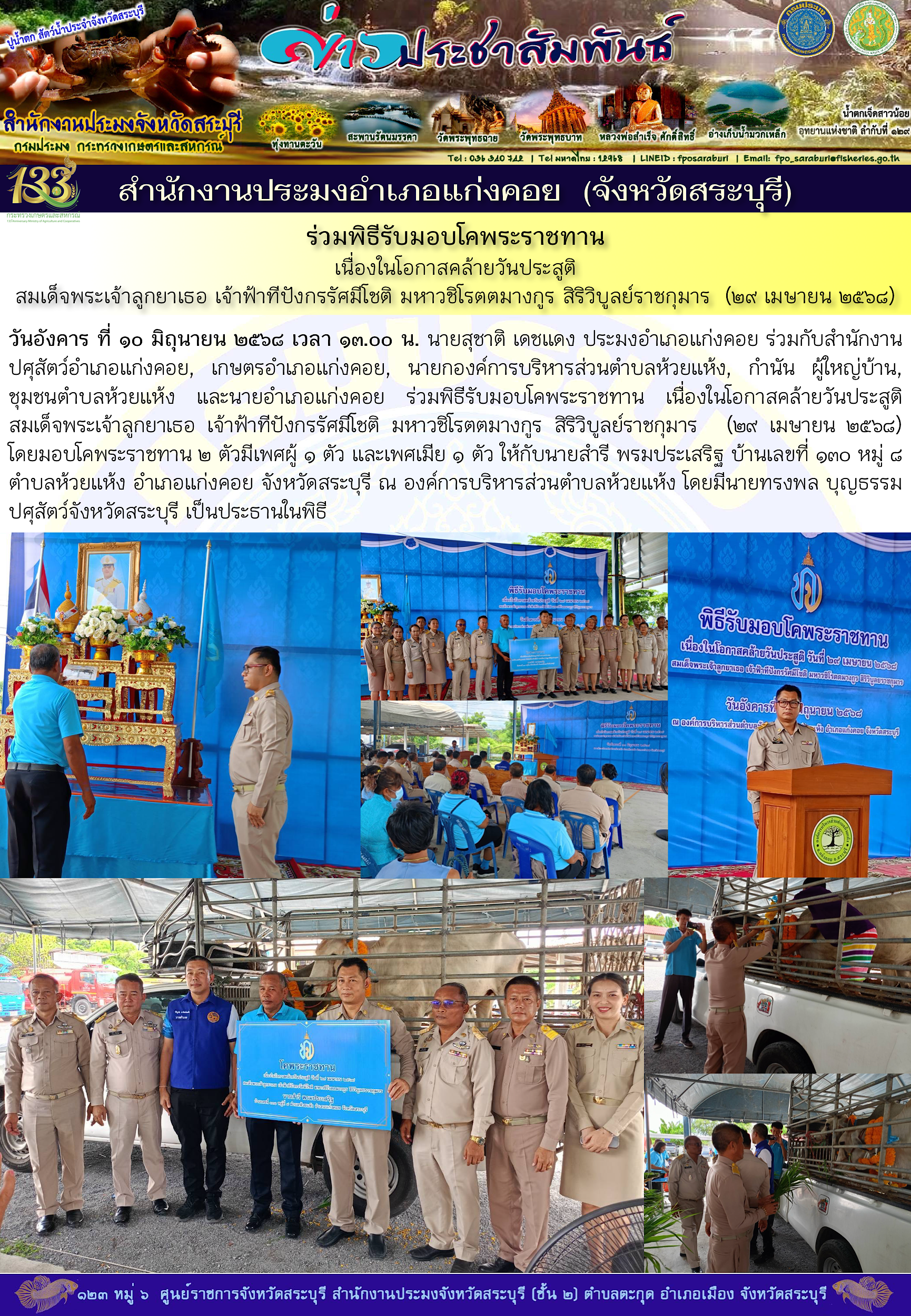 สำนักงานประมงอำเภอแก่งคอย ร่วมพิธีรับมอบโคพระราชทาน เนื่องในโอกาสคล้ายวันประสูติ สมเด็จพระเจ้าลูกยาเธอ เจ้าฟ้าทีปังกรรัศมีโชติ มหาวชิโรตตมางกูร สิริวิบูลย์ราชกุมาร  (๒๙ เมษายน ๒๕๖๘)