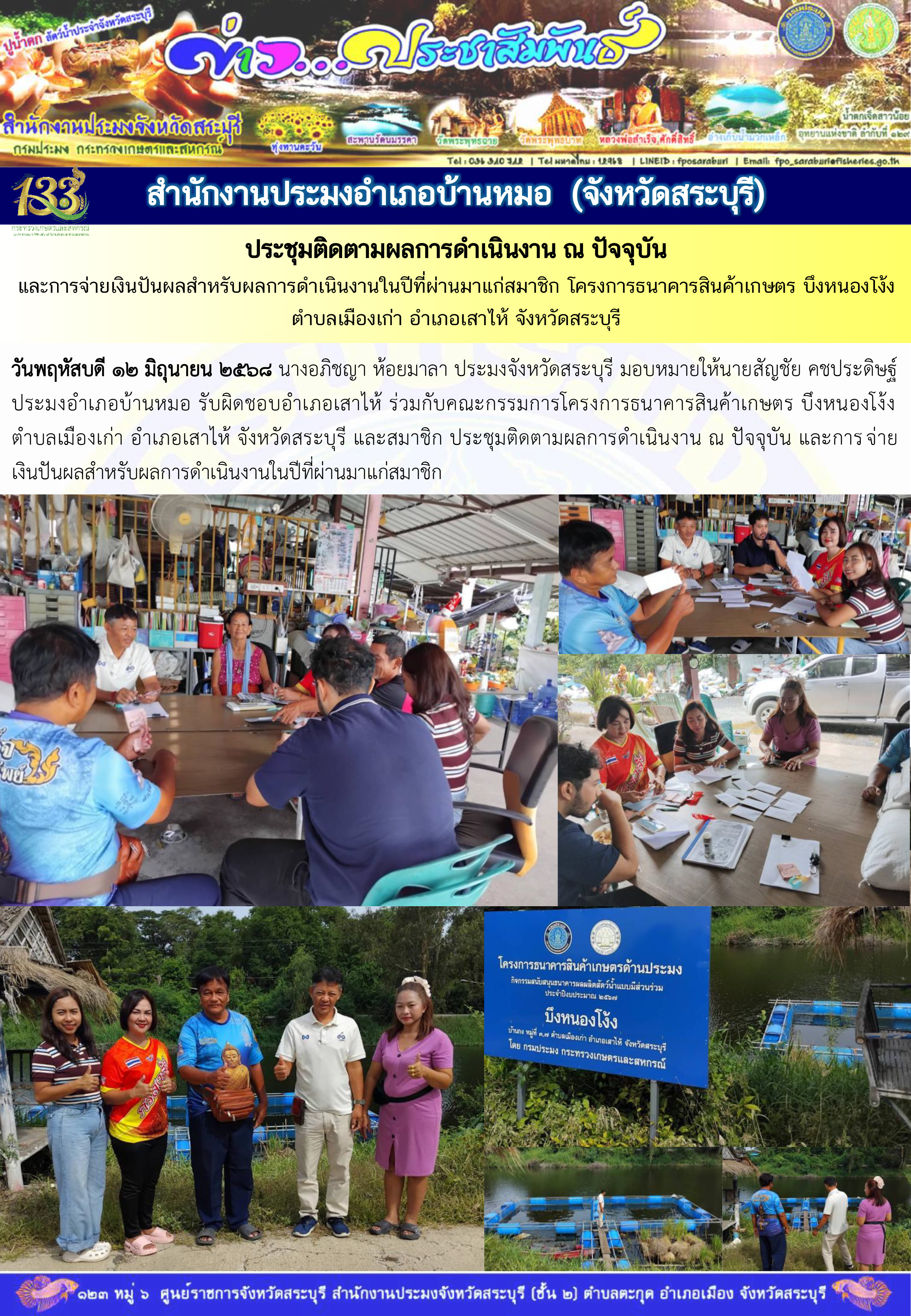 วันพฤหัสบดี ๑๒ มิถุนายน ๒๕๖๘ นางอภิชญา ห้อยมาลา ประมงจังหวัดสระบุรี มอบหมายให้นายสัญชัย คชประดิษฐ์ ประมงอำเภอบ้านหมอ รับผิดชอบอำเภอเสาไห้ ร่วมกับคณะกรรมการโครงการธนาคารสินค้าเกษตร บึงหนองโง้ง ตำบลเมืองเก่า อำเภอเสาไห้ จังหวัดสระบุรี และสมาชิก ประชุมติดตามผลการดำเนินงาน ณ ปัจจุบัน และการจ่ายเงินปันผลสำหรับผลการดำเนินงานในปีที่ผ่านมาแก่สมาชิก
