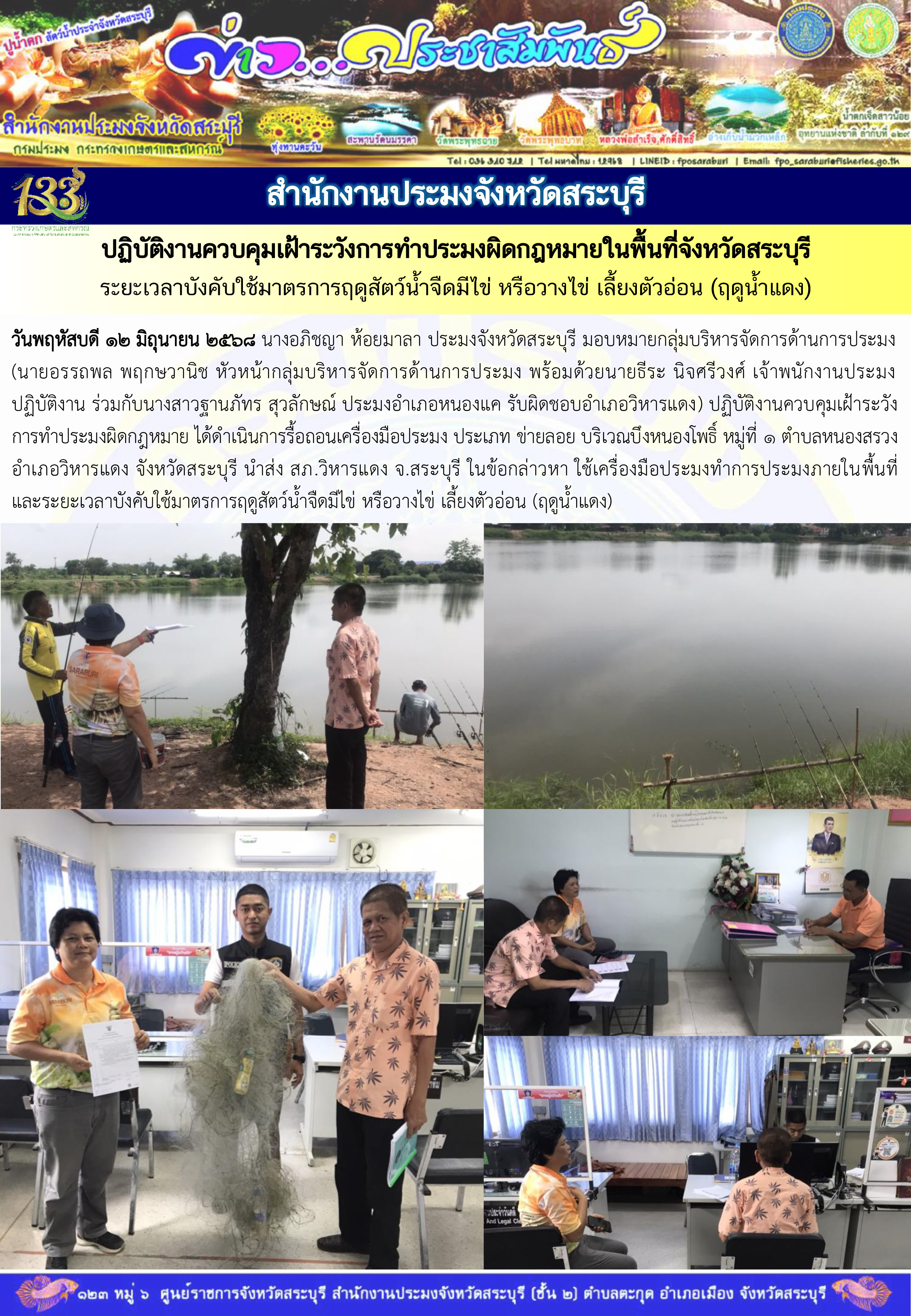 สำนักงานประมงจังหวัดสระบุรี ปฏิบัติงานควบคุมเฝ้าระวังการทำประมงผิดกฎหมายในพื้นที่จังหวัดสระบุรี ระยะเวลาบังคับใช้มาตรการฤดูสัตว์น้ำจืดมีไข่ หรือวางไข่ เลี้ยงตัวอ่อน (ฤดูน้ำแดง)