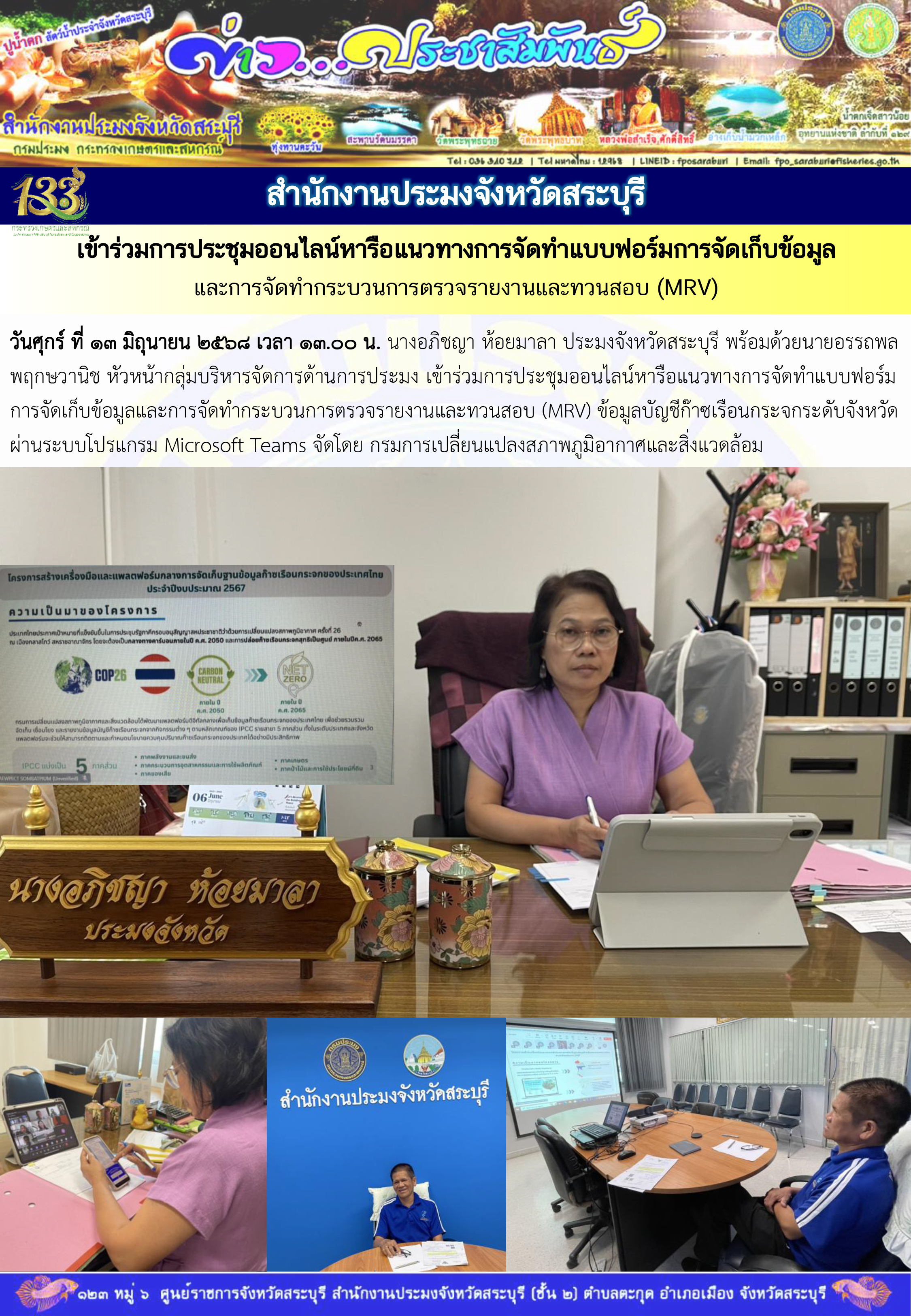 วันศุกร์ ที่ ๑๓ มิถุนายน ๒๕๖๘ เวลา ๑๓.๐๐ น. นางอภิชญา ห้อยมาลา ประมงจังหวัดสระบุรี พร้อมด้วยนายอรรถพล พฤกษวานิช หัวหน้ากลุ่มบริหารจัดการด้านการประมง เข้าร่วมการประชุมออนไลน์หารือแนวทางการจัดทำแบบฟอร์มการจัดเก็บข้อมูลและการจัดทำกระบวนการตรวจรายงานและทวนสอบ (MRV) ข้อมูลบัญชีก๊าซเรือนกระจกระดับจังหวัด ผ่านระบบโปรแกรม Microsoft Teams จัดโดย กรมการเปลี่ยนแปลงสภาพภูมิอากาศและสิ่งแวดล้อม