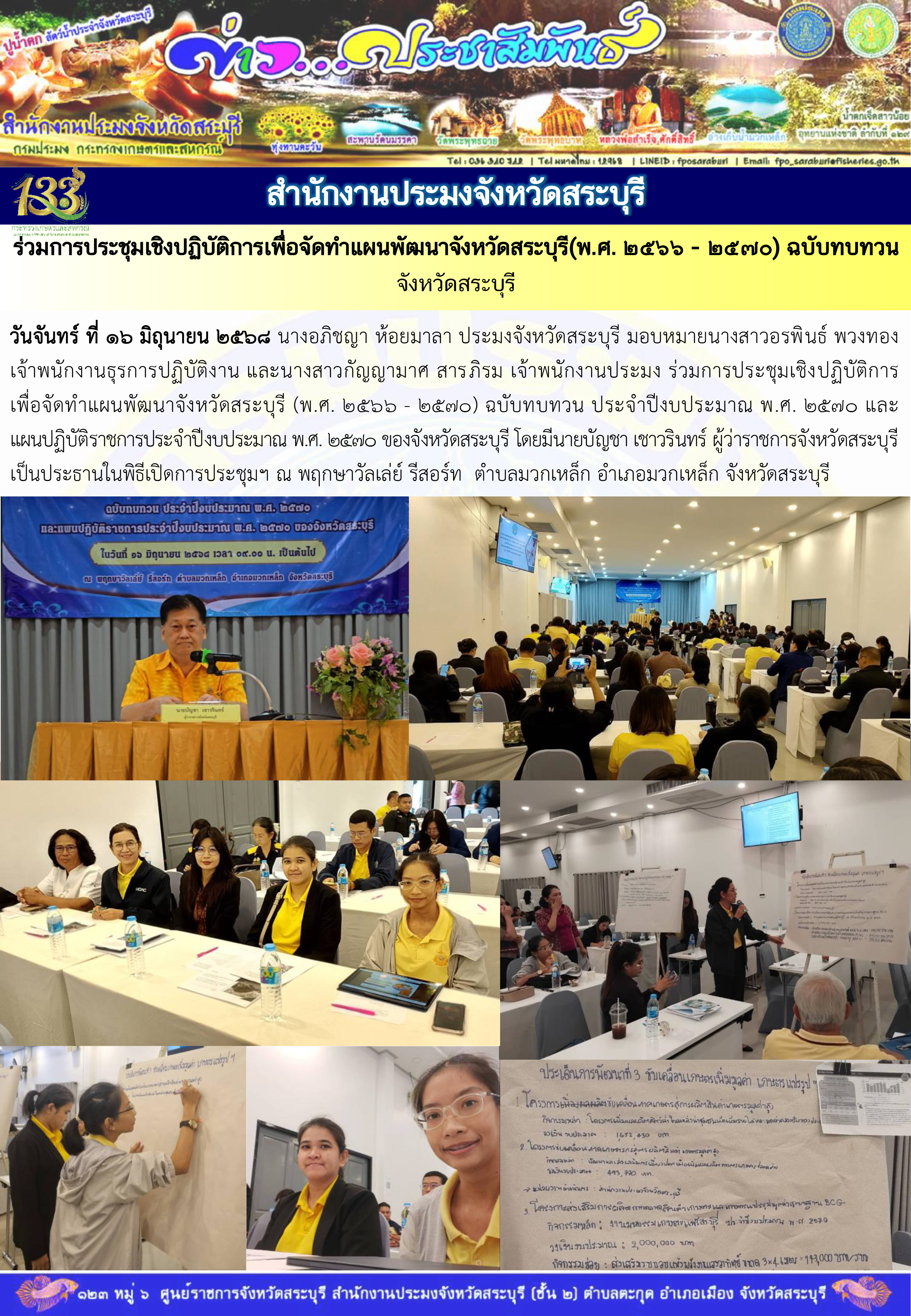 วันจันทร์ ที่ ๑๖ มิถุนายน ๒๕๖๘ นางอภิชญา ห้อยมาลา ประมงจังหวัดสระบุรี มอบหมายนางสาวอรพินธ์ พวงทอง เจ้าพนักงานธุรการปฏิบัติงาน และนางสาวกัญญามาศ สารภิรม เจ้าพนักงานประมง ร่วมการประชุมเชิงปฏิบัติการเพื่อจัดทำแผนพัฒนาจังหวัดสระบุรี (พ.ศ. ๒๕๖๖ - ๒๕๗๐) ฉบับทบทวน ประจำปีงบประมาณ พ.ศ. ๒๕๗๐ และแผนปฏิบัติราชการประจำปีงบประมาณ พ.ศ. ๒๕๗๐ ของจังหวัดสระบุรี โดยมีนายบัญชา เชาวรินทร์ ผู้ว่าราชการจังหวัดสระบุรี  เป็นประธานในพิธีเปิดการประชุมฯ ณ พฤกษาวัลเล่ย์ รีสอร์ท  ตำบลมวกเหล็ก อำเภอมวกเหล็ก จังหวัดสระบุรี