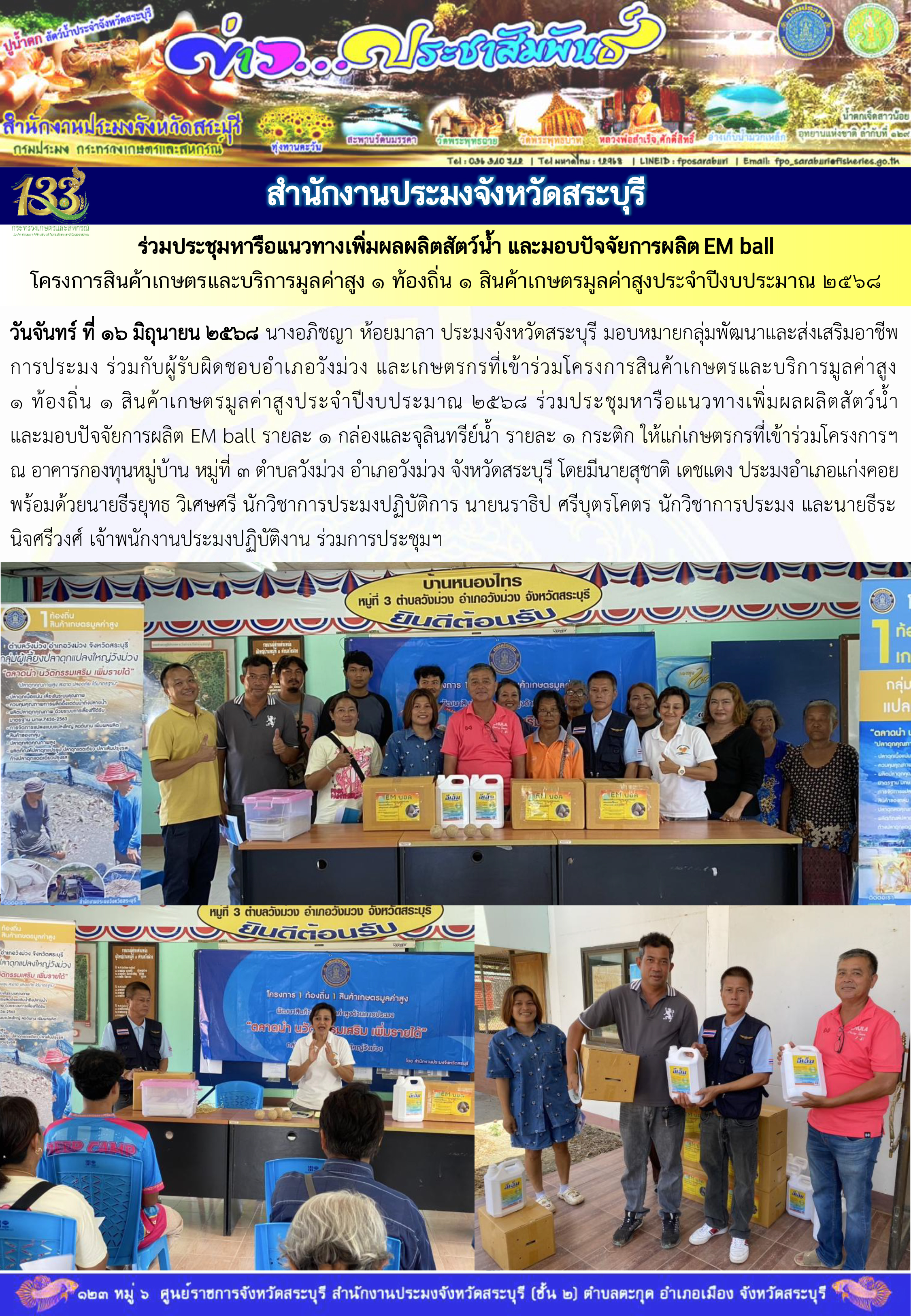 สำนักงานประมงจังหวัดสระบุรี ร่วมประชุมหารือแนวทางเพิ่มผลผลิตสัตว์น้ำ และมอบปัจจัยการผลิต EM ball โครงการสินค้าเกษตรและบริการมูลค่าสูง ๑ ท้องถิ่น ๑ สินค้าเกษตรมูลค่าสูงประจำปีงบประมาณ ๒๕๖๘