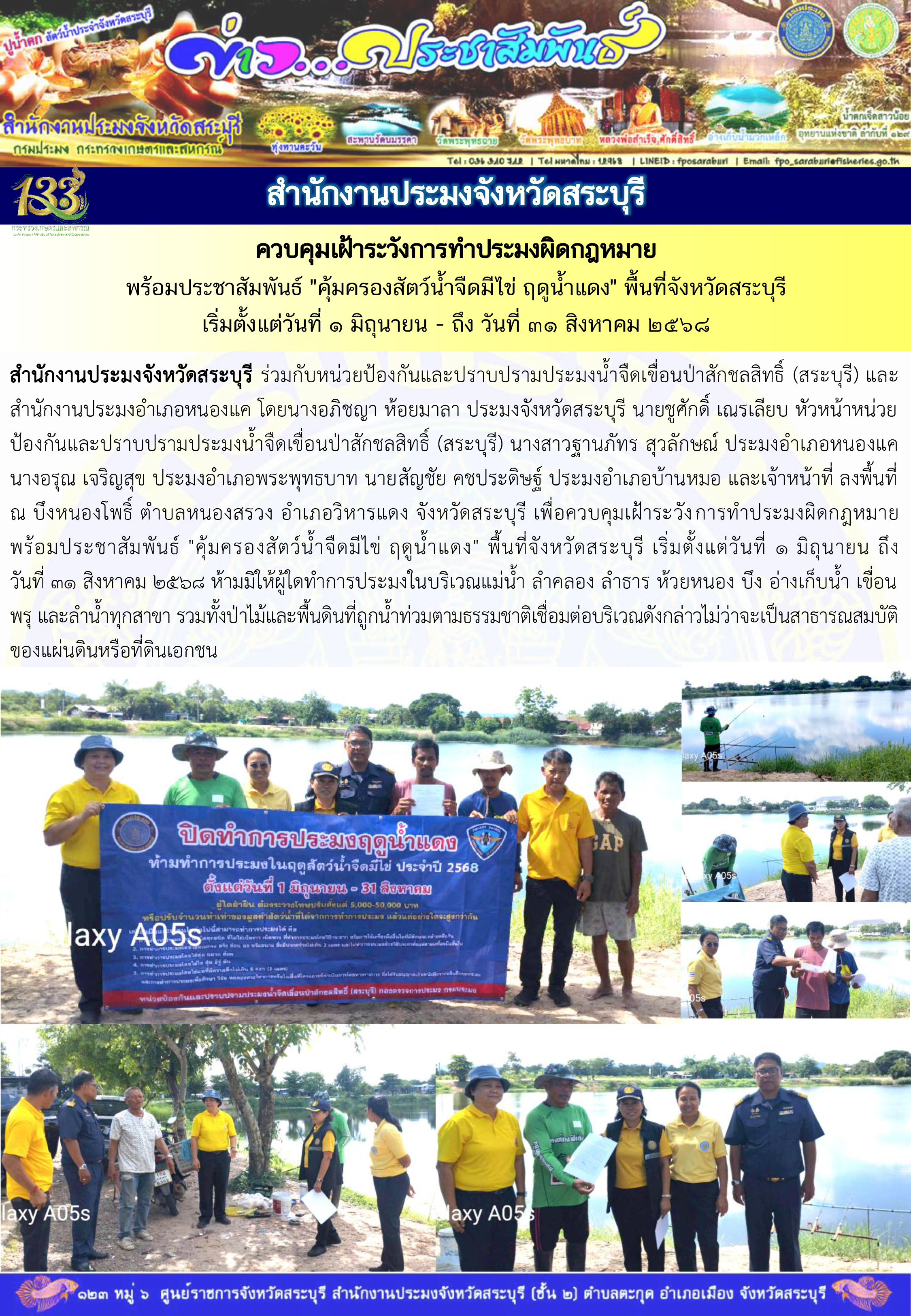 สำนักงานประมงจังหวัดสระบุรี ควบคุมเฝ้าระวังการทำประมงผิดกฎหมาย พร้อมประชาสัมพันธ์ "คุ้มครองสัตว์น้ำจืดมีไข่ ฤดูน้ำแดง" พื้นที่จังหวัดสระบุรี เริ่มตั้งแต่วันที่ ๑ มิถุนายน - ถึง วันที่ ๓๑ สิงหาคม ๒๕๖๘
