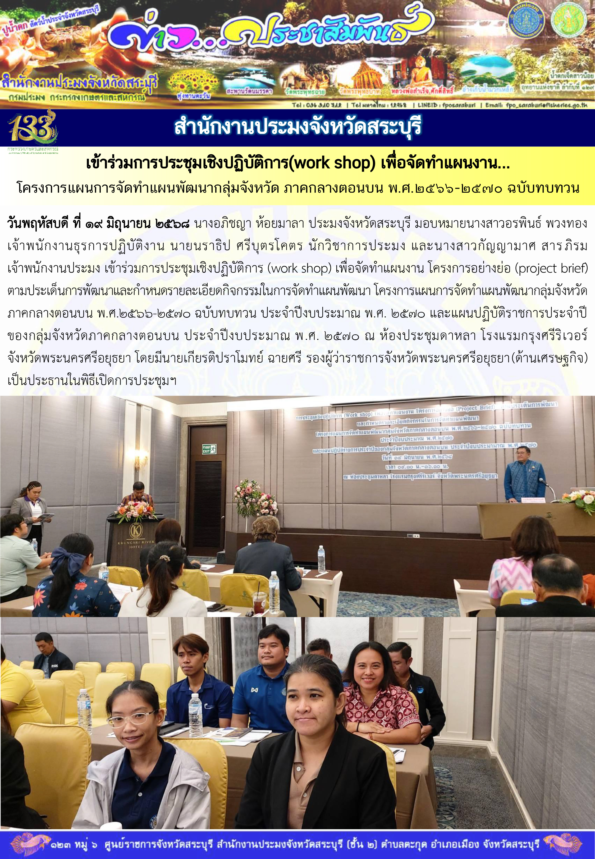 วันพฤหัสบดี ที่ ๑๙ มิถุนายน ๒๕๖๘ นางอภิชญา ห้อยมาลา ประมงจังหวัดสระบุรี มอบหมายนางสาวอรพินธ์ พวงทอง เจ้าพนักงานธุรการปฏิบัติงาน นายนราธิป ศรีบุตรโคตร นักวิชาการประมง และนางสาวกัญญามาศ สารภิรม เจ้าพนักงานประมง เข้าร่วมการประชุมเชิงปฏิบัติการ(work shop) เพื่อจัดทำแผนงาน โครงการอย่างย่อ (project brief) ตามประเด็นการพัฒนาและกำหนดรายละเอียดกิจกรรมในการจัดทำแผนพัฒนา โครงการแผนการจัดทำแผนพัฒนากลุ่มจังหวัด ภาคกลางตอนบน พ.ศ.๒๕๖๖-๒๕๗๐ ฉบับทบทวน ประจำปีงบประมาณ พ.ศ. ๒๕๗๐ และแผนปฏิบัติราชการประจำปีของกลุ่มจังหวัดภาคกลางตอนบน ประจำปีงบประมาณ พ.ศ. ๒๕๗๐ ณ ห้องประชุมดาหลา โรงแรมกรุงศรีริเวอร์ จังหวัดพระนครศรีอยุธยา โดยมีนายเกียรติปราโมทย์ ฉายศรี รองผู้ว่าราชการจังหวัดพระนครศรีอยุธยา(ด้านเศรษฐกิจ) เป็นประธานในพิธีเปิดการประชุมฯ