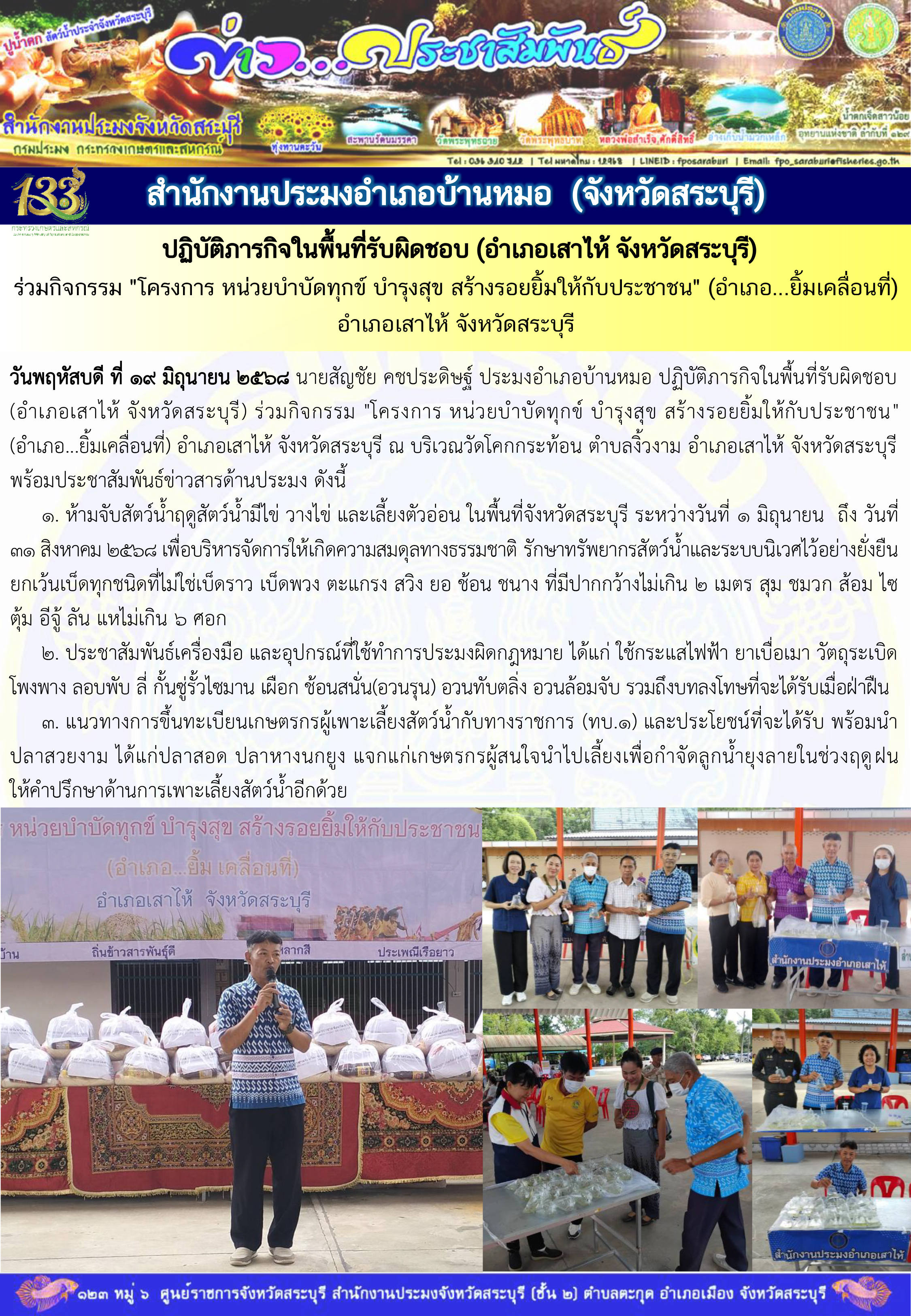 วันพฤหัสบดี ที่ ๑๙ มิถุนายน ๒๕๖๘ นายสัญชัย คชประดิษฐ์ ประมงอำเภอบ้านหมอ ปฏิบัติภารกิจในพื้นที่รับผิดชอบ (อำเภอเสาไห้ จังหวัดสระบุรี) ร่วมกิจกรรม "โครงการ หน่วยบำบัดทุกข์ บำรุงสุข สร้างรอยยิ้มให้กับประชาชน" (อำเภอ...ยิ้มเคลื่อนที่) อำเภอเสาไห้ จังหวัดสระบุรี ณ บริเวณวัดโคกกระท้อน ตำบลงิ้วงาม อำเภอเสาไห้ จังหวัดสระบุรี พร้อมประชาสัมพันธ์ข่าวสารด้านประมง ดังนี้