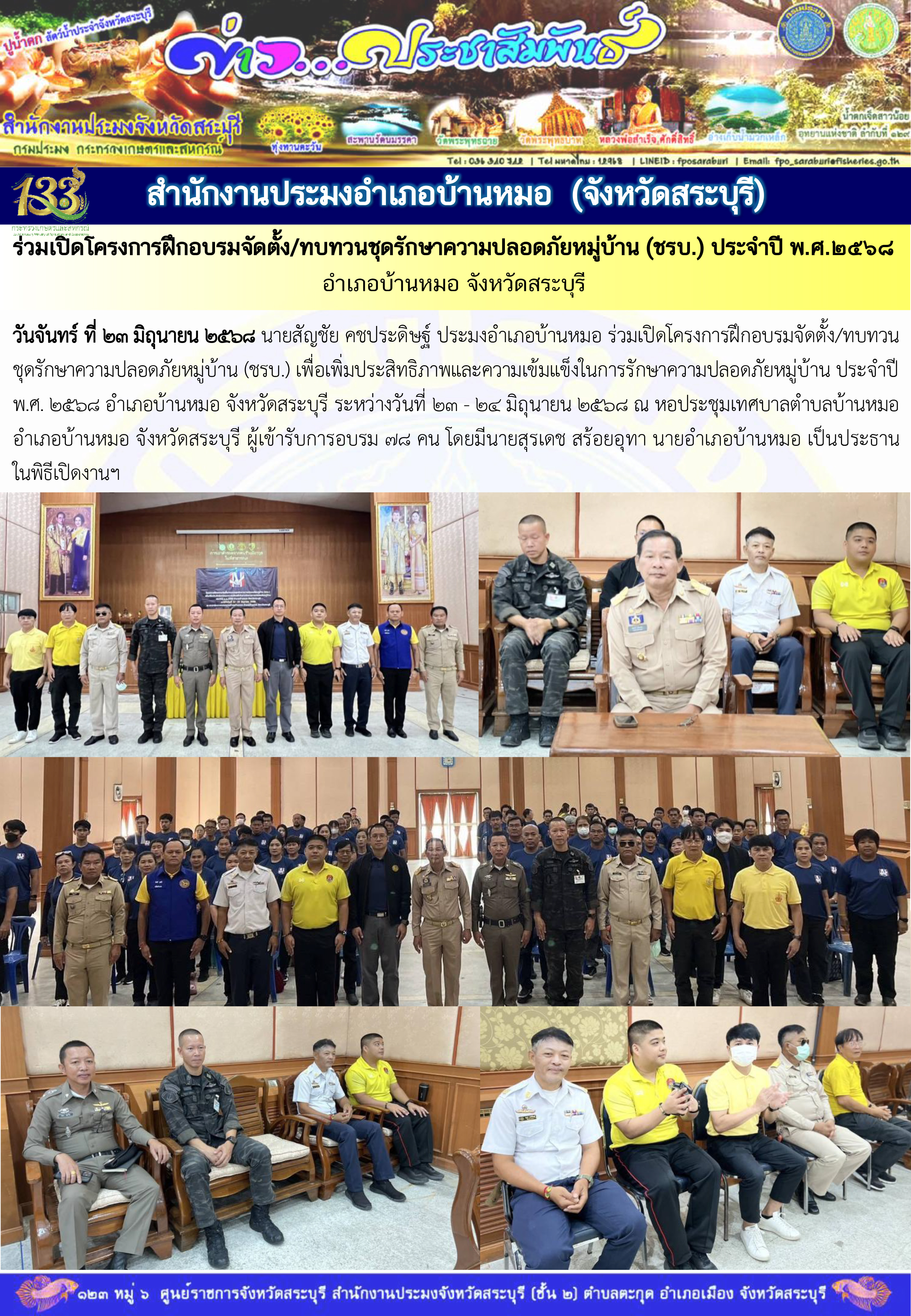 วันจันทร์ ที่ ๒๓ มิถุนายน ๒๕๖๘ นายสัญชัย คชประดิษฐ์ ประมงอำเภอบ้านหมอ ร่วมเปิดโครงการฝึกอบรมจัดตั้ง/ทบทวนชุดรักษาความปลอดภัยหมู่บ้าน (ชรบ.) เพื่อเพิ่มประสิทธิภาพและความเข้มแข็งในการรักษาความปลอดภัยหมู่บ้าน ประจำปี พ.ศ. ๒๕๖๘ อำเภอบ้านหมอ จังหวัดสระบุรี ระหว่างวันที่ ๒๓ – ๒๔ มิถุนายน ๒๕๖๘ ณ หอประชุมเทศบาลตำบลบ้านหมอ อำเภอบ้านหมอ จังหวัดสระบุรี ผู้เข้ารับการอบรม ๗๘ คน โดยมีนายสุรเดช สร้อยอุทา นายอำเภอบ้านหมอ เป็นประธาน