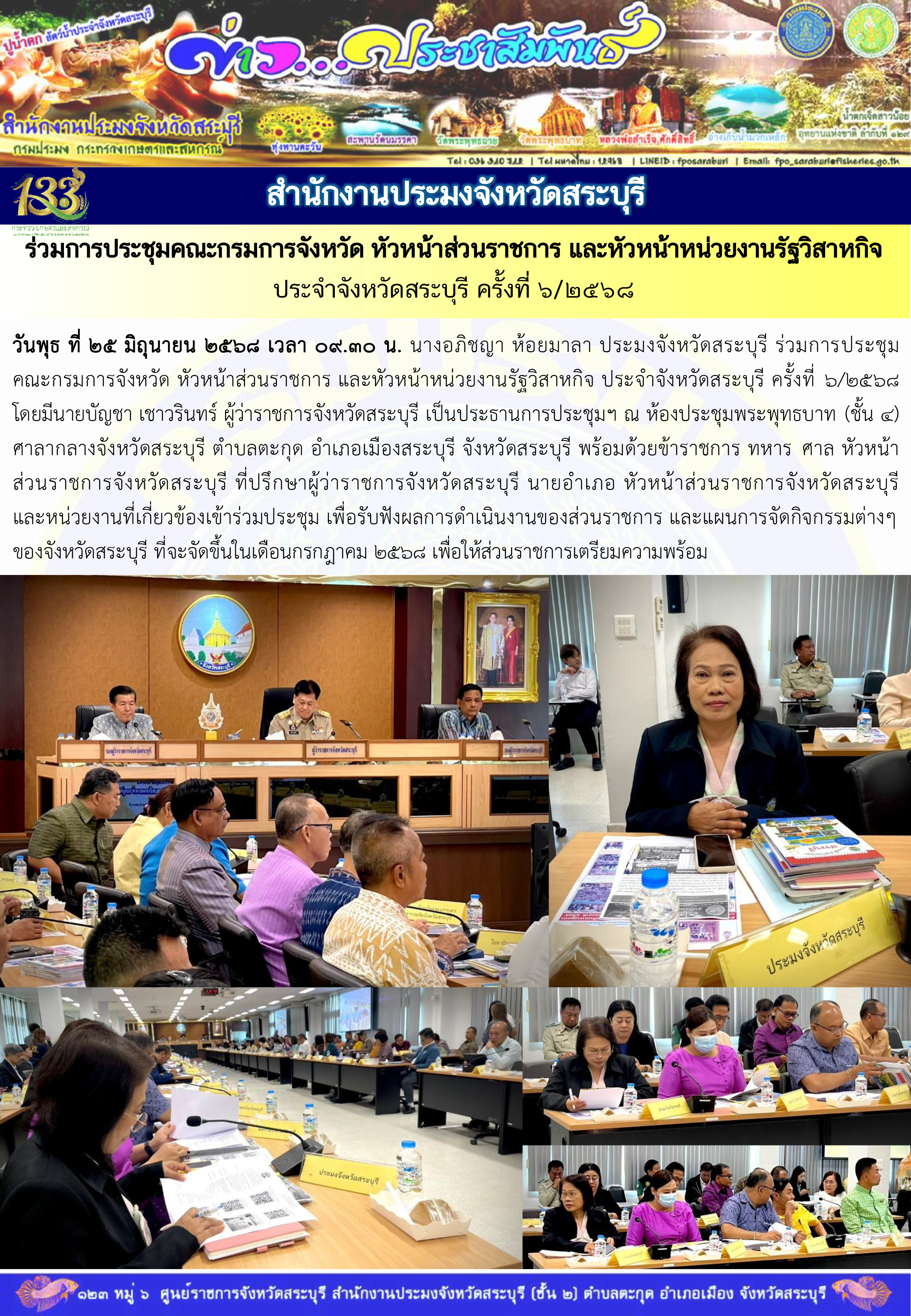 สำนักงานประมงจังหวัดสระบุรี ร่วมการประชุมคณะกรมการจังหวัด หัวหน้าส่วนราชการ และหัวหน้าหน่วยงานรัฐวิสาหกิจ ประจำจังหวัดสระบุรี ครั้งที่ ๖/๒๕๖๘