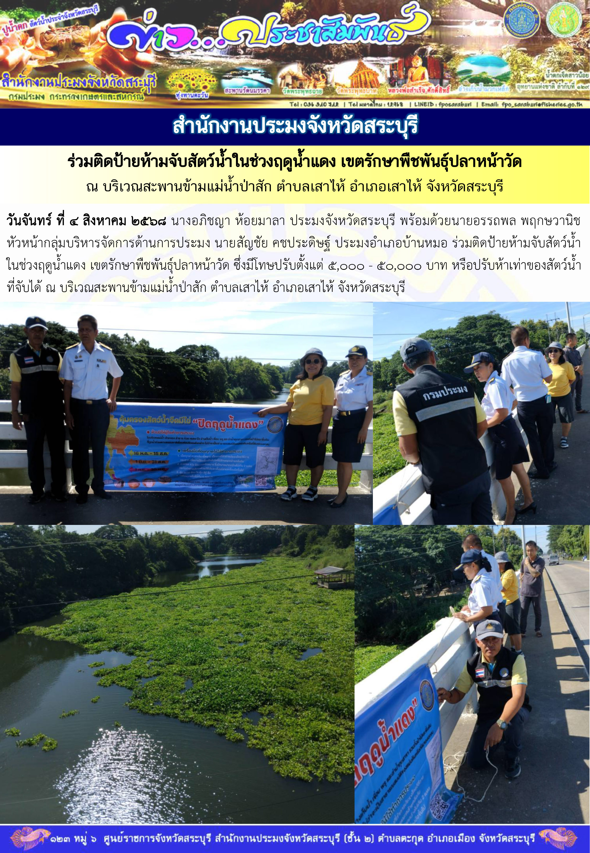 สำนักงานประมงจังหวัดสระบุรี ร่วมติดป้ายห้ามจับสัตว์น้ำในช่วงฤดูน้ำแดง เขตรักษาพืชพันธุ์ปลาหน้าวัด ณ บริเวณสะพานข้ามแม่น้ำป่าสัก ตำบลเสาไห้ อำเภอเสาไห้ จังหวัดสระบุรี