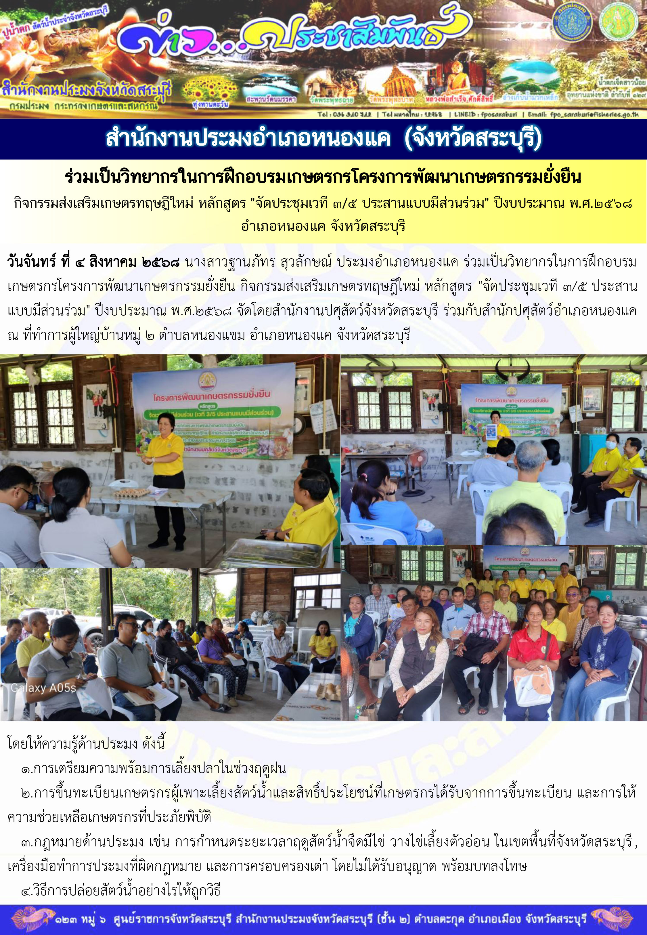 วันจันทร์ ที่ ๔ สิงหาคม ๒๕๖๘ นางสาวฐานภัทร  สุวลักษณ์ ประมงอำเภอหนองแค ร่วมเป็นวิทยากรในการฝึกอบรมเกษตรกรโครงการพัฒนาเกษตรกรรมยั่งยืน กิจกรรมส่งเสริมเกษตรทฤษฎีใหม่ หลักสูตร "จัดประชุมเวที ๓/๕ ประสานแบบมีส่วนร่วม" ปีงบประมาณ พ.ศ.๒๕๖๘ จัดโดยสำนักงานปศุสัตว์จังหวัดสระบุรี ร่วมกับสำนักปศุสัตว์อำเภอหนองแค ณ ที่ทำการผู้ใหญ่บ้านหมู่ ๒ ตำบลหนองแขม อำเภอหนองแค จังหวัดสระบุรี โดยให้ความรู้ด้านประมง ดังนี้
