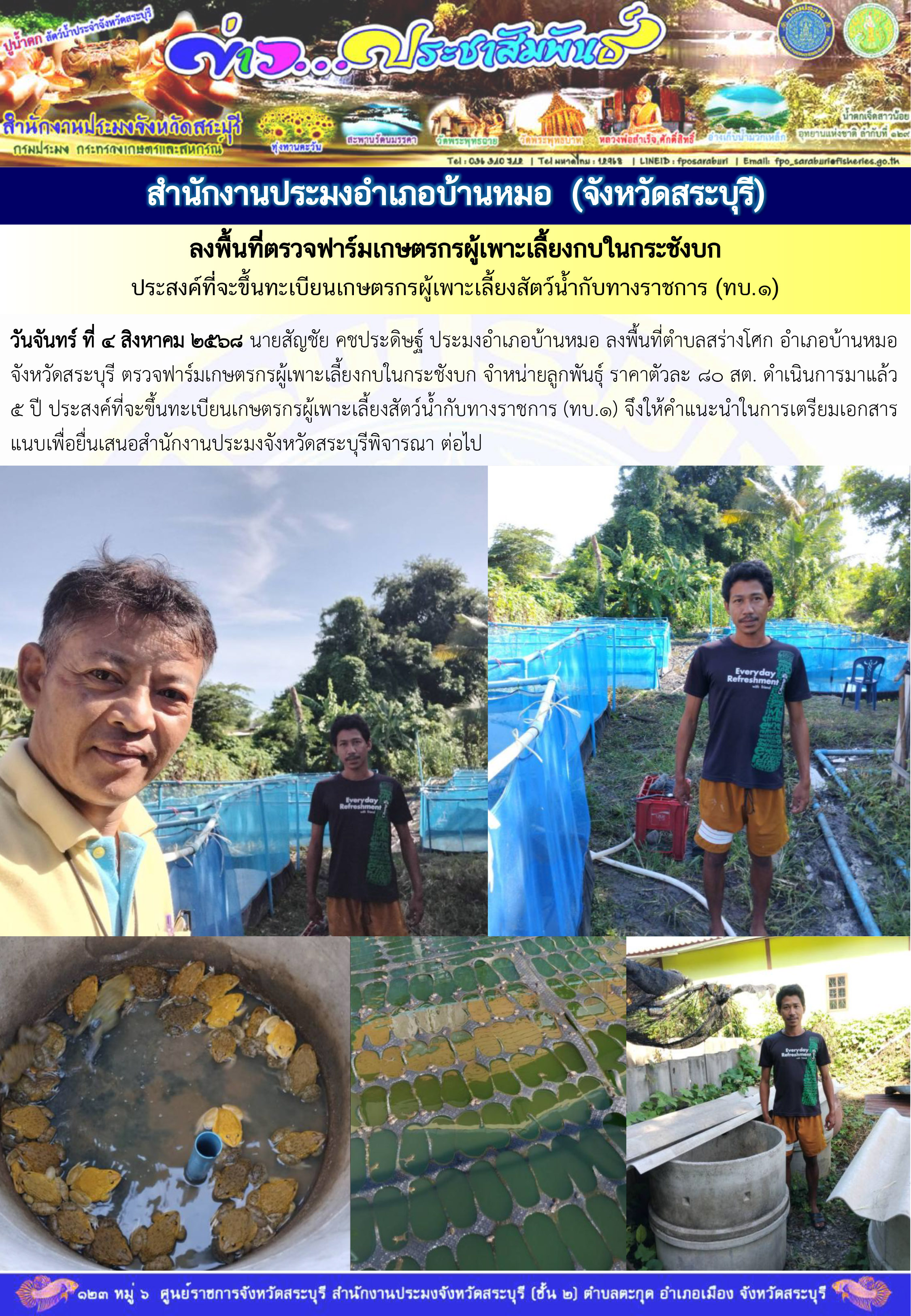 วันจันทร์ ที่ ๔ สิงหาคม ๒๕๖๘ นายสัญชัย คชประดิษฐ์ ประมงอำเภอบ้านหมอ ลงพื้นที่ตำบลสร่างโศก อำเภอบ้านหมอ จังหวัดสระบุรี ตรวจฟาร์มเกษตรกรผู้เพาะเลี้ยงกบในกระชังบก จำหน่ายลูกพันธุ์ ราคาตัวละ ๘๐ สต.ดำเนินการมาแล้ว ๕ ปี ประสงค์ที่จะขึ้นทะเบียนเกษตรกรผู้เพาะเลี้ยงสัตว์น้ำกับทางราชการ (ทบ.๑) จึงให้คำแนะนำในการเตรียมเอกสารแนบเพื่อยื่นเสนอสำนักงานประมงจังหวัดสระบุรีพิจารณา ต่อไป