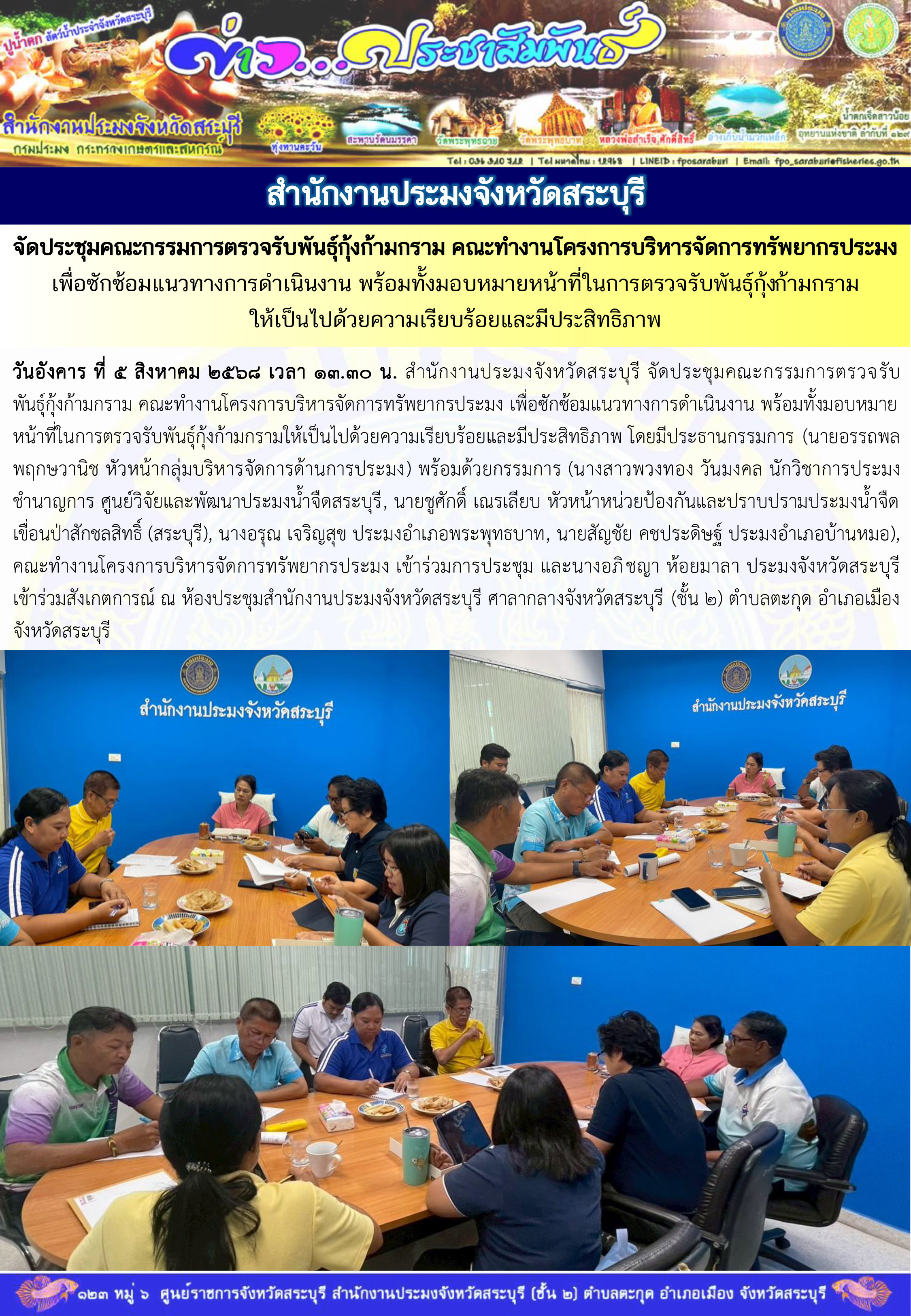 วันอังคาร ที่ ๕ สิงหาคม ๒๕๖๘ เวลา ๑๓.๓๐ น. สำนักงานประมงจังหวัดสระบุรี จัดประชุมคณะกรรมการตรวจรับพันธุ์กุ้งก้ามกราม คณะทำงานโครงการบริหารจัดการทรัพยากรประมง เพื่อซักซ้อมแนวทางการดำเนินงาน พร้อมทั้งมอบหมายหน้าที่ในการตรวจรับพันธุ์กุ้งก้ามกรามให้เป็นไปด้วยความเรียบร้อยและมีประสิทธิภาพ โดยมีประธานกรรมการ (นายอรรถพล พฤกษวานิช หัวหน้ากลุ่มบริหารจัดการด้านการประมง) พร้อมด้วยกรรมการ (นางสาวพวงทอง วันมงคล นักวิชาการประมงชำนาญการ ศูนย์วิจัยและพัฒนาประมงน้ำจืดสระบุรี, นายชูศักดิ์ เณรเลียบ หัวหน้าหน่วยป้องกันและปราบปรามประมงน้ำจืดเขื่อนป่าสักชลสิทธิ์ (สระบุรี), นางอรุณ เจริญสุข ประมงอำเภอพระพุทธบาท, นายสัญชัย คชประดิษฐ์ ประมงอำเภอบ้านหมอ), คณะทำงานโครงการบริหารจัดการทรัพยากรประมง เข้าร่วมการประชุม และนางอภิชญา ห้อยมาลา ประมงจังหวัดสระบุรี เข้าร่วมสังเกตการณ์ ณ ห้องประชุมสำนักงานประมงจังหวัดสระบุรี ศาลากลางจังหวัดสระบุรี (ชั้น ๒) ตำบลตะกุด อำเภอเมือง จังหวัดสระบุรี