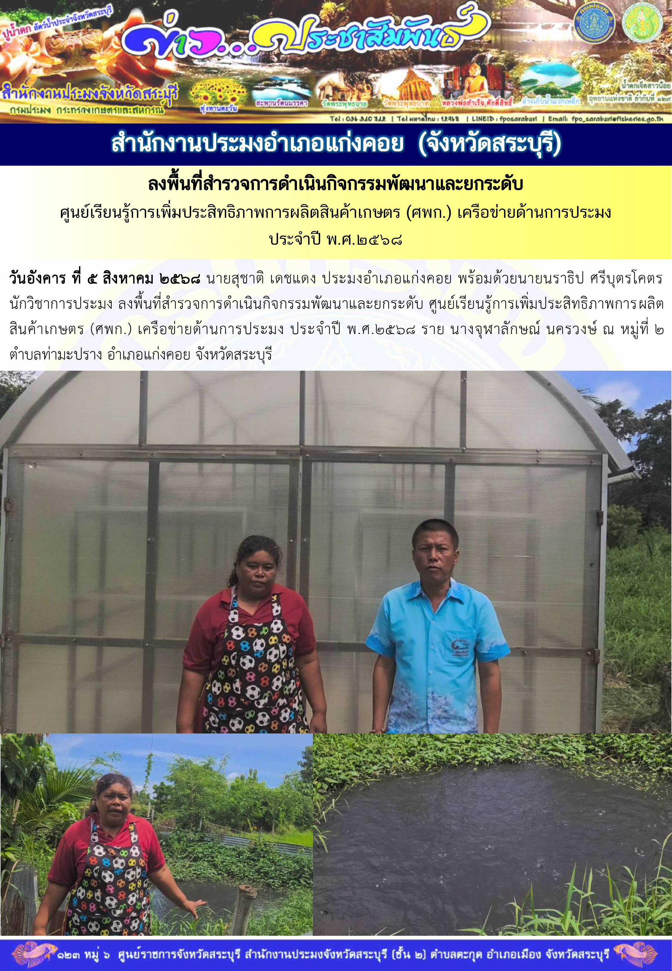 วันอังคาร ที่ ๕ สิงหาคม ๒๕๖๘ นายสุชาติ เดชแดง ประมงอำเภอแก่งคอย พร้อมด้วยนายนราธิป ศรีบุตรโคตร นักวิชาการประมง ลงพื้นที่สำรวจการดำเนินกิจกรรมพัฒนาและยกระดับ ศูนย์เรียนรู้การเพิ่มประสิทธิภาพการผลิตสินค้าเกษตร (ศพก.) เครือข่ายด้านการประมง ประจำปี พ.ศ.๒๕๖๘ ราย นางจุฬาลักษณ์ นครวงษ์ ณ หมู่ที่ ๒ ตำบลท่ามะปราง อำเภอแก่งคอย จังหวัดสระบุรี