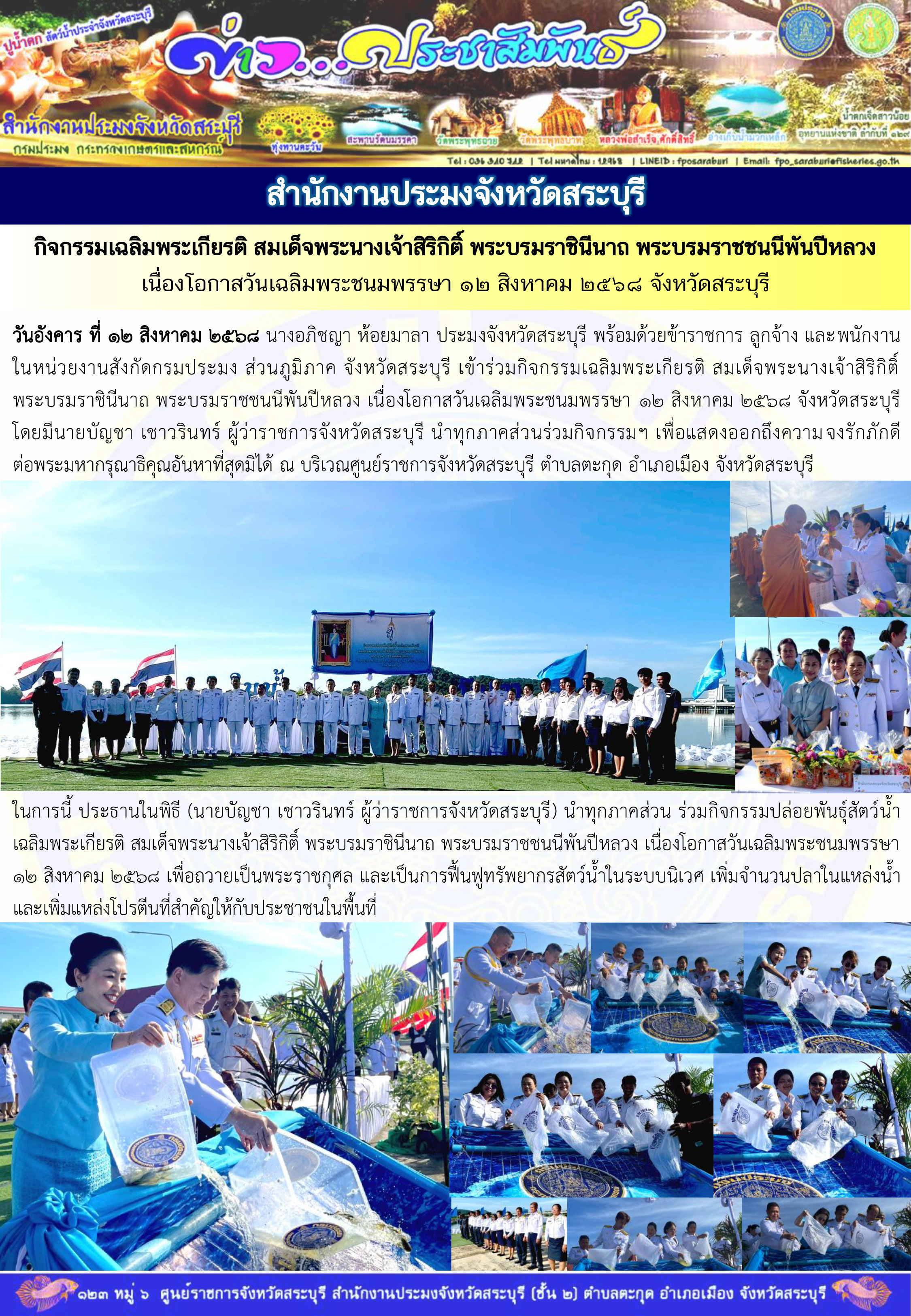 ในการนี้ ประธานในพิธี (นายบัญชา เชาวรินทร์ ผู้ว่าราชการจังหวัดสระบุรี) นำทุกภาคส่วน ร่วมกิจกรรมปล่อยพันธุ์สัตว์น้ำเฉลิมพระเกียรติ สมเด็จพระนางเจ้าสิริกิติ์ พระบรมราชินีนาถ พระบรมราชชนนีพันปีหลวง เนื่องโอกาสวันเฉลิมพระชนมพรรษา ๑๒ สิงหาคม ๒๕๖๘ เพื่อถวายเป็นพระราชกุศล และเป็นการฟื้นฟูทรัพยากรสัตว์น้ำในระบบนิเวศ เพิ่มจำนวนปลาในแหล่งน้ำ และเพิ่มแหล่งโปรตีนที่สำคัญให้กับประชาชนในพื้นที่