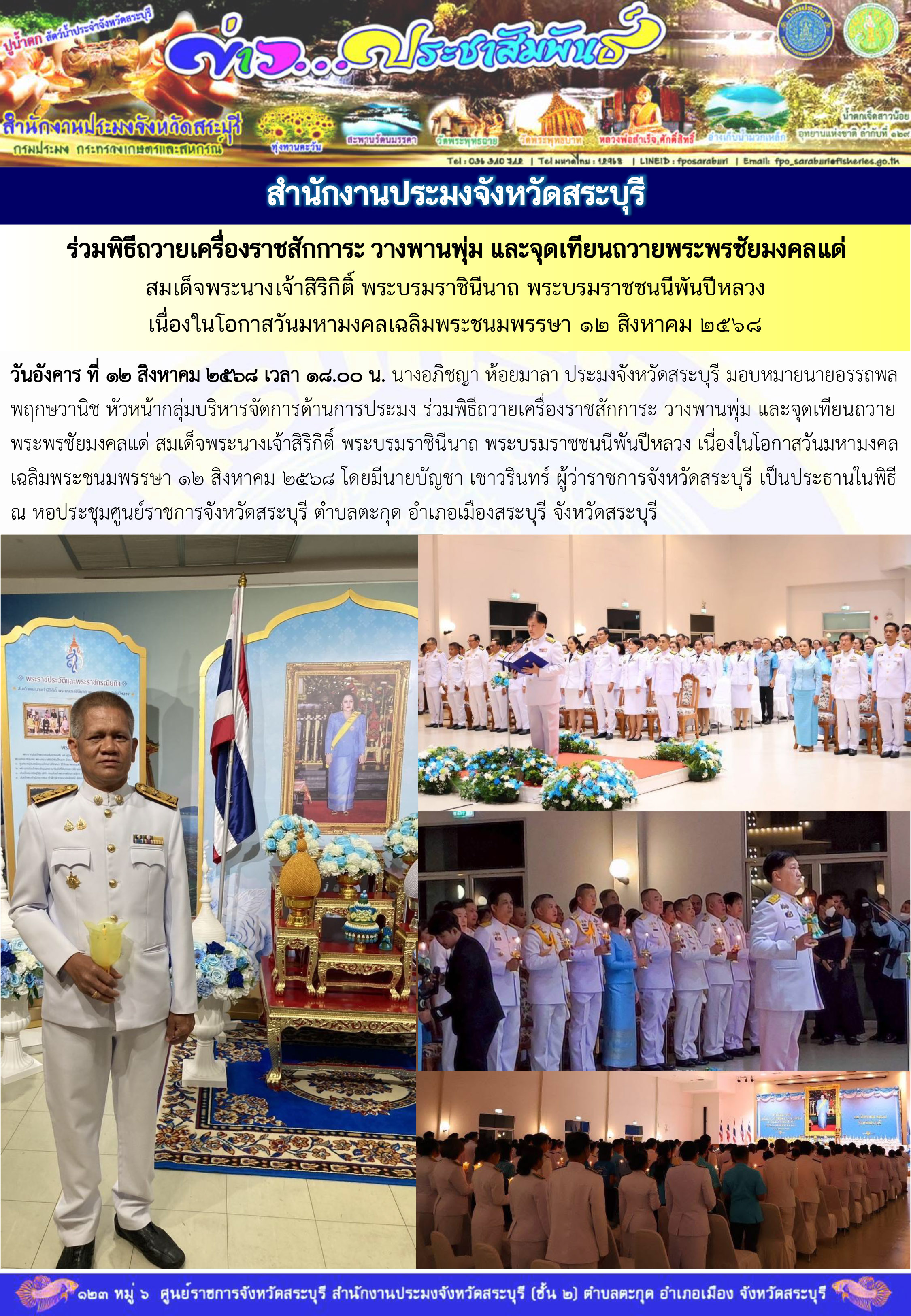 สำนักงานประมงจังหวัดสระบุรี ร่วมพิธีถวายเครื่องราชสักการะ วางพานพุ่ม และจุดเทียนถวายพระพรชัยมงคลแด่ สมเด็จพระนางเจ้าสิริกิติ์ พระบรมราชินีนาถ พระบรมราชชนนีพันปีหลวง เนื่องในโอกาสวันมหามงคลเฉลิมพระชนมพรรษา ๑๒ สิงหาคม ๒๕๖๘