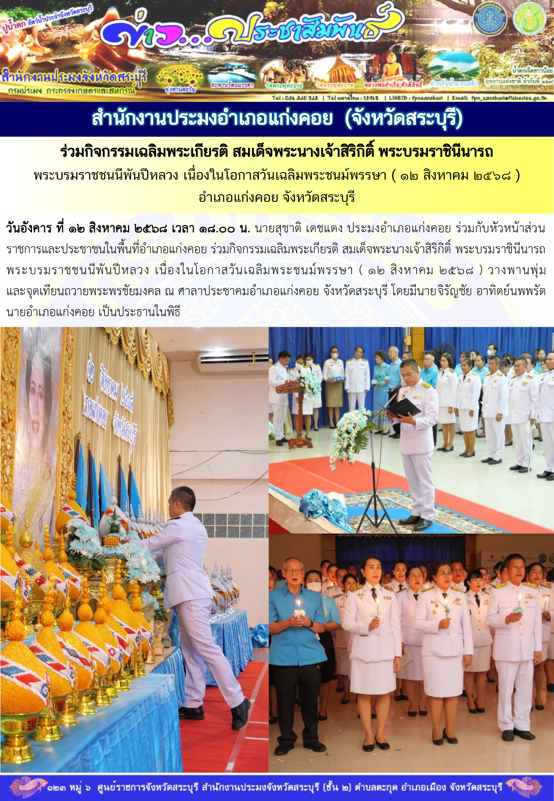 วันอังคาร ที่ ๑๒ สิงหาคม ๒๕๖๘ เวลา ๑๘.๐๐ น. นายสุชาติ เดชแดง ประมงอำเภอแก่งคอย ร่วมกับหัวหน้าส่วนราชการและประชาชนในพื้นที่อำเภอแก่งคอย ร่วมกิจกรรมเฉลิมพระเกียรติ สมเด็จพระนางเจ้าสิริกิติ์ พระบรมราชินีนารถ พระบรมราชชนนีพันปีหลวง เนื่องในโอกาสวันเฉลิมพระชนม์พรรษา ( ๑๒ สิงหาคม ๒๕๖๘ ) วางพานพุ่ม และจุดเทียนถวายพระพรชัยมงคล ณ ศาลาประชาคมอำเภอแก่งคอย จังหวัดสระบุรี โดยมีนายจิรัญชัย อาทิตย์นพพรัต นายอำเภอแก่งคอย เป็นประธานในพิธี