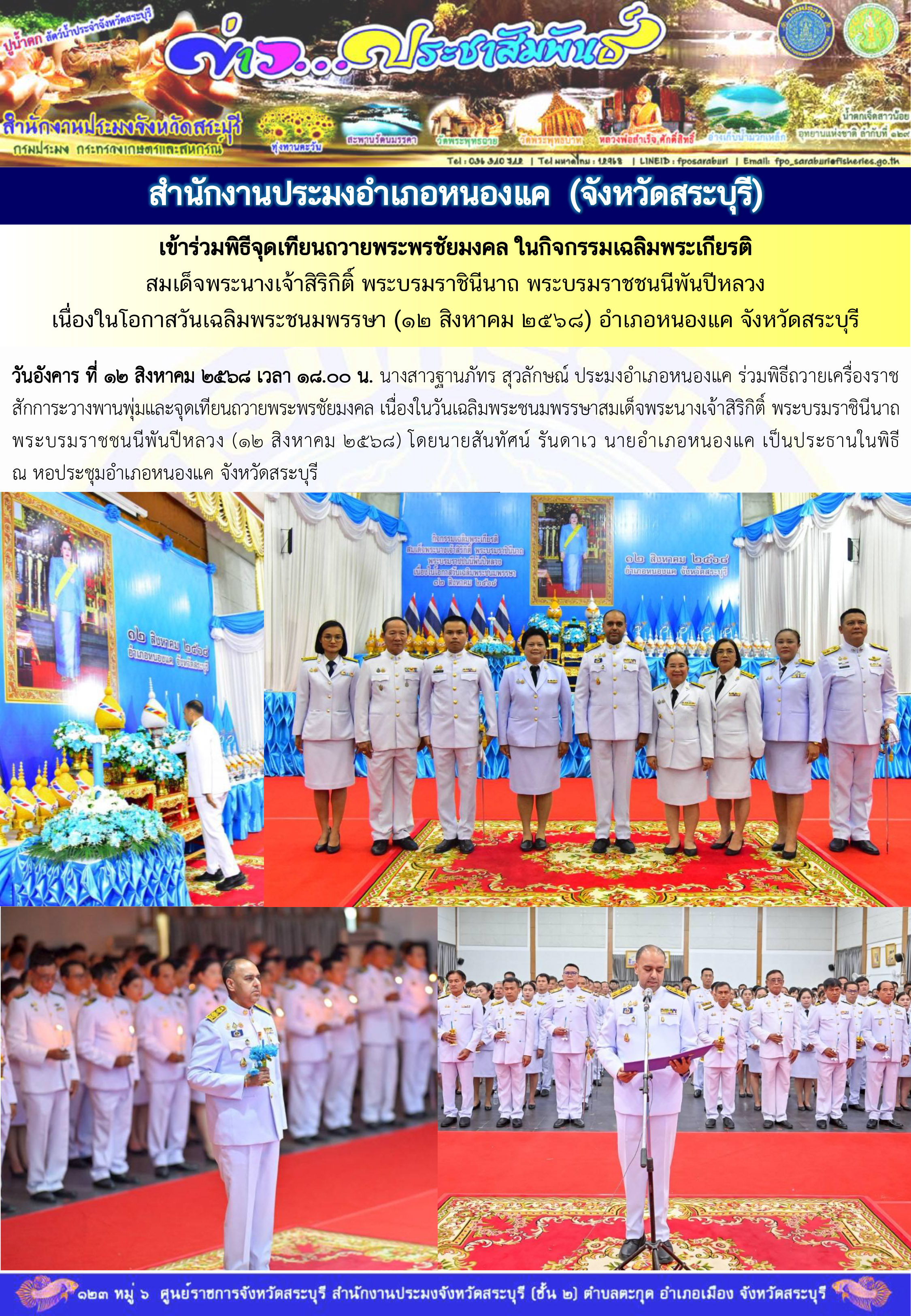 สำนักงานประมงอำเภอหนองแค เข้าร่วมพิธีจุดเทียนถวายพระพรชัยมงคล ในกิจกรรมเฉลิมพระเกียรติสมเด็จพระนางเจ้าสิริกิติ์ พระบรมราชินีนาถ พระบรมราชชนนีพันปีหลวง เนื่องในโอกาสวันเฉลิมพระชนมพรรษา (๑๒ สิงหาคม ๒๕๖๘) อำเภอหนองแค จังหวัดสระบุรี