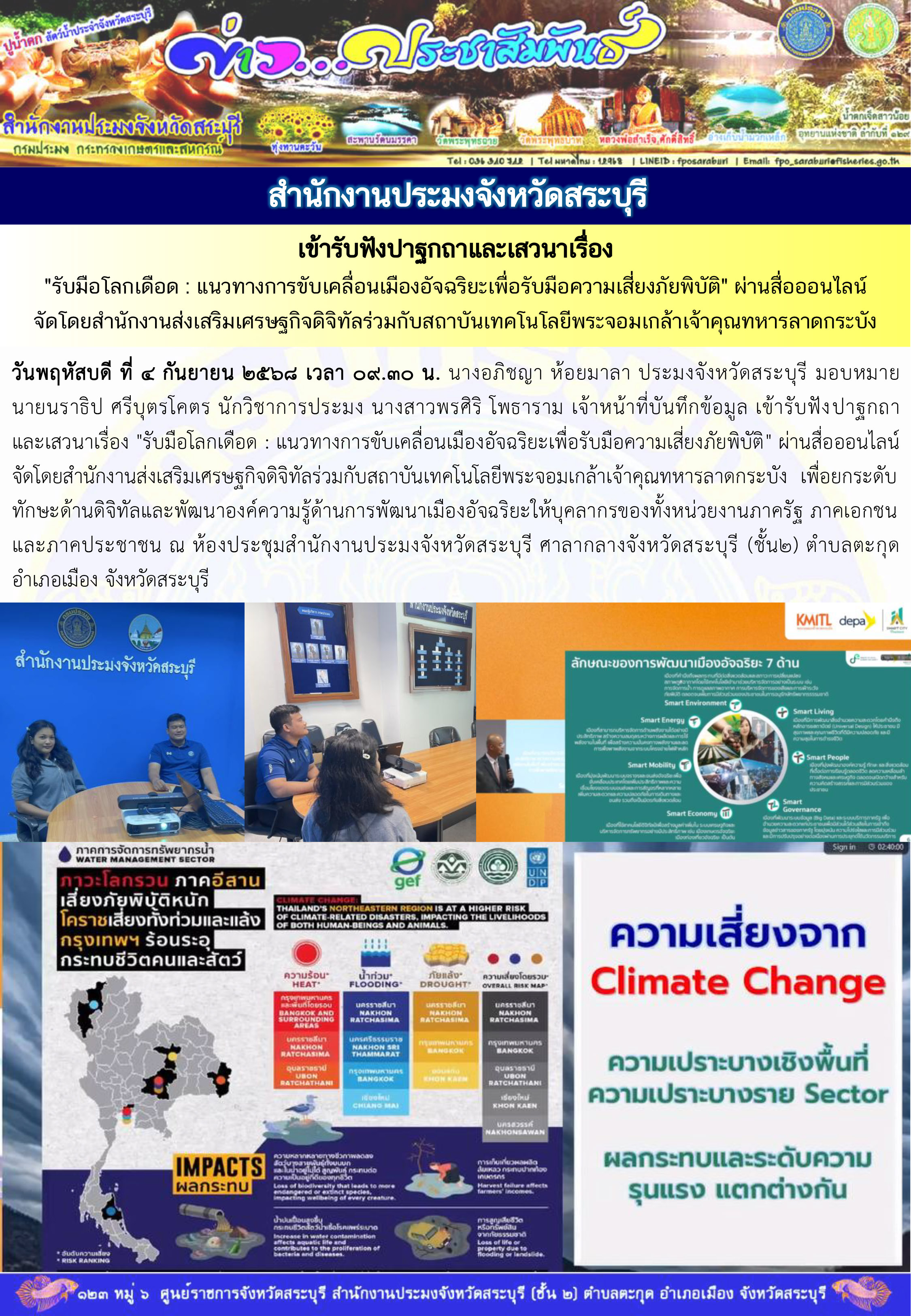 วันพฤหัสบดี ที่ ๔ กันยายน ๒๕๖๘ เวลา ๐๙.๓๐ น. นางอภิชญา ห้อยมาลา ประมงจังหวัดสระบุรี มอบหมายนายนราธิป ศรีบุตรโคตร นักวิชาการประมง นางสาวพรศิริ โพธาราม เจ้าหน้าที่บันทึกข้อมูล เข้ารับฟังปาฐกถาและเสวนาเรื่อง "รับมือโลกเดือด : แนวทางการขับเคลื่อนเมืองอัจฉริยะเพื่อรับมือความเสี่ยงภัยพิบัติ" ผ่านสื่อออนไลน์ จัดโดยสำนักงานส่งเสริมเศรษฐกิจดิจิทัลร่วมกับสถาบันเทคโนโลยีพระจอมเกล้าเจ้าคุณทหารลาดกระบัง  เพื่อยกระดับทักษะด้านดิจิทัลและพัฒนาองค์ความรู้ด้านการพัฒนาเมืองอัจฉริยะให้บุคลากรของทั้งหน่วยงานภาครัฐ ภาคเอกชน และภาคประชาชน ณ ห้องประชุมสำนักงานประมงจังหวัดสระบุรี ศาลากลางจังหวัดสระบุรี (ชั้น๒) ตำบลตะกุด อำเภอเมือง จังหวัดสระบุรี