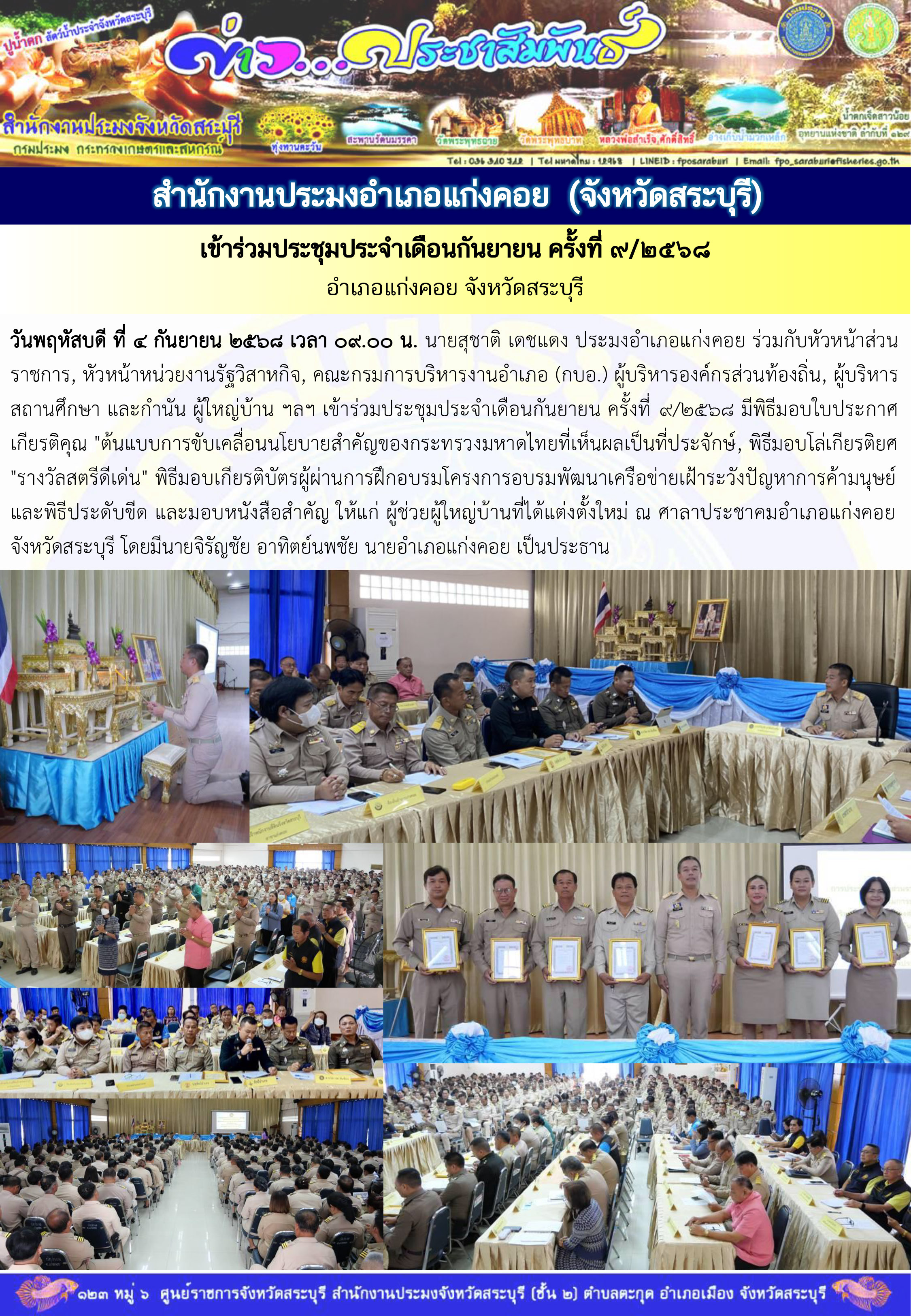 วันพฤหัสบดี ที่ ๔ กันยายน ๒๕๖๘ เวลา ๐๙.๐๐ น. นายสุชาติ เดชแดง ประมงอำเภอแก่งคอย ร่วมกับหัวหน้าส่วนราชการ, หัวหน้าหน่วยงานรัฐวิสาหกิจ, คณะกรมการบริหารงานอำเภอ (กบอ.) ผู้บริหารองค์กรส่วนท้องถิ่น, ผู้บริหารสถานศึกษา และกำนัน ผู้ใหญ่บ้าน ฯลฯ เข้าร่วมประชุมประจำเดือนกันยายน ครั้งที่ ๙/๒๕๖๘ มีพิธีมอบใบประกาศเกียรติคุณ "ต้นแบบการขับเคลื่อนนโยบายสำคัญของกระทรวงมหาดไทยที่เห็นผลเป็นที่ประจักษ์, พิธีมอบโล่เกียรติยศ "รางวัลสตรีดีเด่น" พิธีมอบเกียรติบัตรผู้ผ่านการฝึกอบรมโครงการอบรมพัฒนาเครือข่ายเฝ้าระวังปัญหาการค้ามนุษย์ และพิธีประดับขีด และมอบหนังสือสำคัญ ให้แก่ ผู้ช่วยผู้ใหญ่บ้านที่ได้แต่งตั้งใหม่ ณ ศาลาประชาคมอำเภอแก่งคอย จังหวัดสระบุรี โดยมีนายจิรัญชัย อาทิตย์นพชัย นายอำเภอแก่งคอย เป็นประธาน