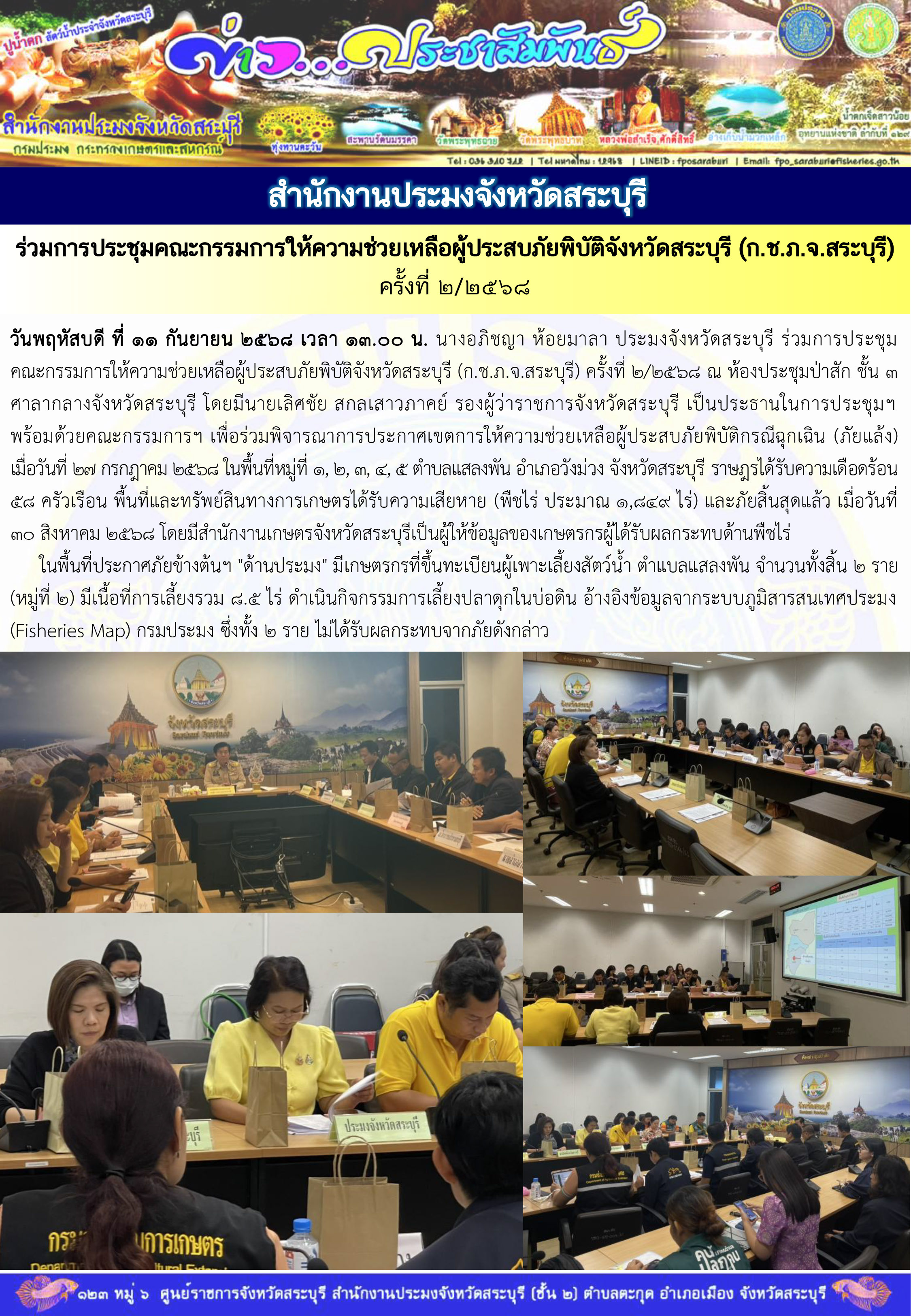 วันพฤหัสบดี ที่ ๑๑ กันยายน ๒๕๖๘ เวลา ๑๓.๐๐ น. นางอภิชญา ห้อยมาลา ประมงจังหวัดสระบุรี ร่วมการประชุมคณะกรรมการให้ความช่วยเหลือผู้ประสบภัยพิบัติจังหวัดสระบุรี (ก.ช.ภ.จ.สระบุรี) ครั้งที่ ๒/๒๕๖๘ ณ ห้องประชุมป่าสัก ชั้น ๓ ศาลากลางจังหวัดสระบุรี โดยมีนายเลิศชัย สกลเสาวภาคย์ รองผู้ว่าราชการจังหวัดสระบุรี เป็นประธานในการประชุมฯ พร้อมด้วยคณะกรรมการฯ เพื่อร่วมพิจารณาการประกาศเขตการให้ความช่วยเหลือผู้ประสบภัยพิบัติกรณีฉุกเฉิน (ภัยแล้ง) เมื่อวันที่ ๒๗ กรกฎาคม ๒๕๖๘ ในพื้นที่หมู่ที่ ๑, ๒, ๓, ๔, ๕ ตำบลแสลงพัน อำเภอวังม่วง จังหวัดสระบุรี ราษฎรได้รับความเดือดร้อน ๕๘ ครัวเรือน พื้นที่และทรัพย์สินทางการเกษตรได้รับความเสียหาย (พืชไร่ ประมาณ ๑,๘๔๙ ไร่) และภัยสิ้นสุดแล้ว เมื่อวันที่ ๓๐ สิงหาคม ๒๕๖๘ โดยมีสำนักงานเกษตรจังหวัดสระบุรีเป็นผู้ให้ข้อมูลของเกษตรกรผู้ได้รับผลกระทบด้านพืชไร่