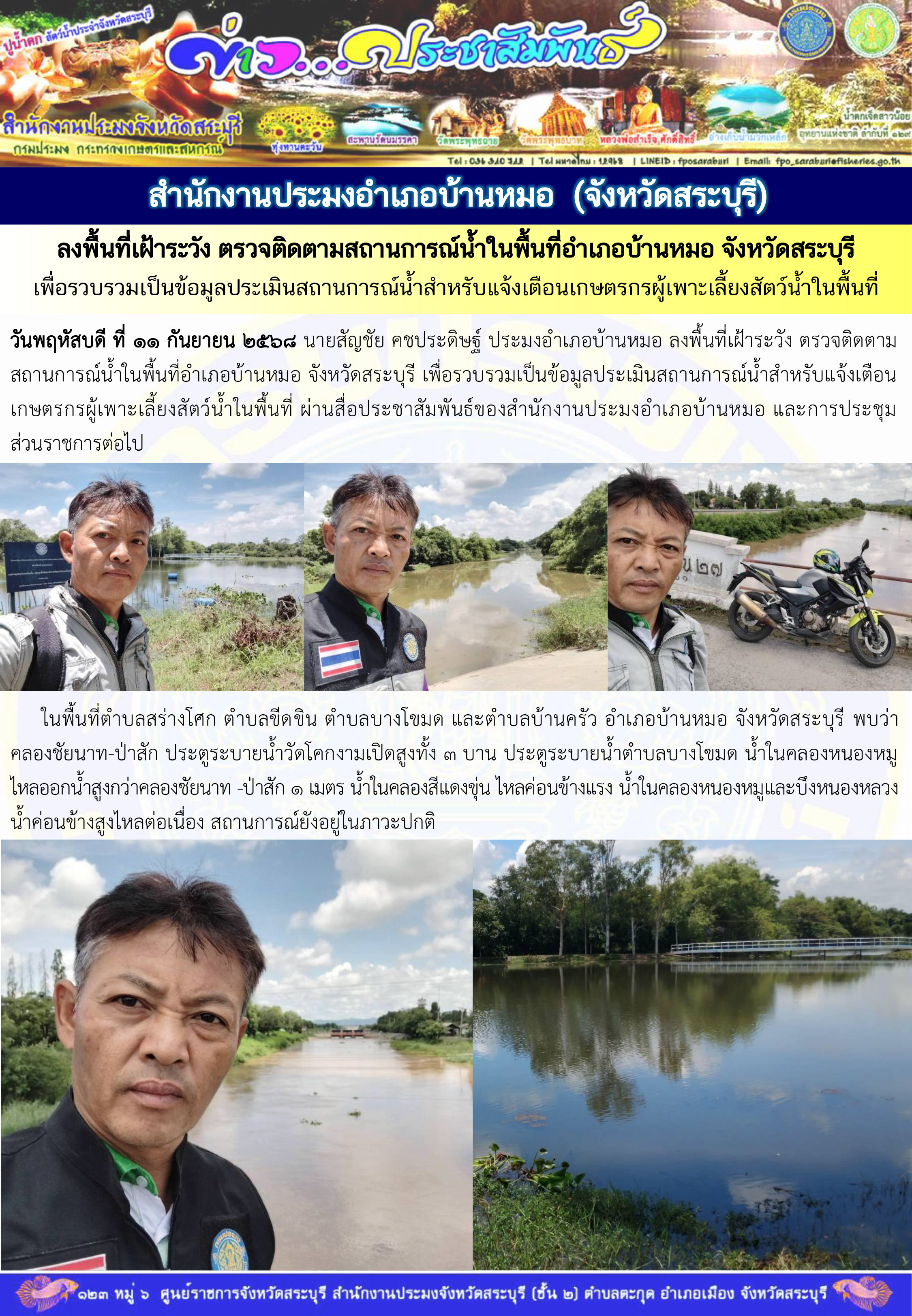 วันพฤหัสบดี ที่ ๑๑ กันยายน ๒๕๖๘ นายสัญชัย คชประดิษฐ์ ประมงอำเภอบ้านหมอ ลงพื้นที่เฝ้าระวัง ตรวจติดตามสถานการณ์น้ำในพื้นที่อำเภอบ้านหมอ จังหวัดสระบุรี เพื่อรวบรวมเป็นข้อมูลประเมินสถานการณ์น้ำสำหรับแจ้งเตือนเกษตรกรผู้เพาะเลี้ยงสัตว์น้ำในพื้นที่ ผ่านสื่อประชาสัมพันธ์ของสำนักงานประมงอำเภอบ้านหมอ และการประชุมส่วนราชการต่อไป