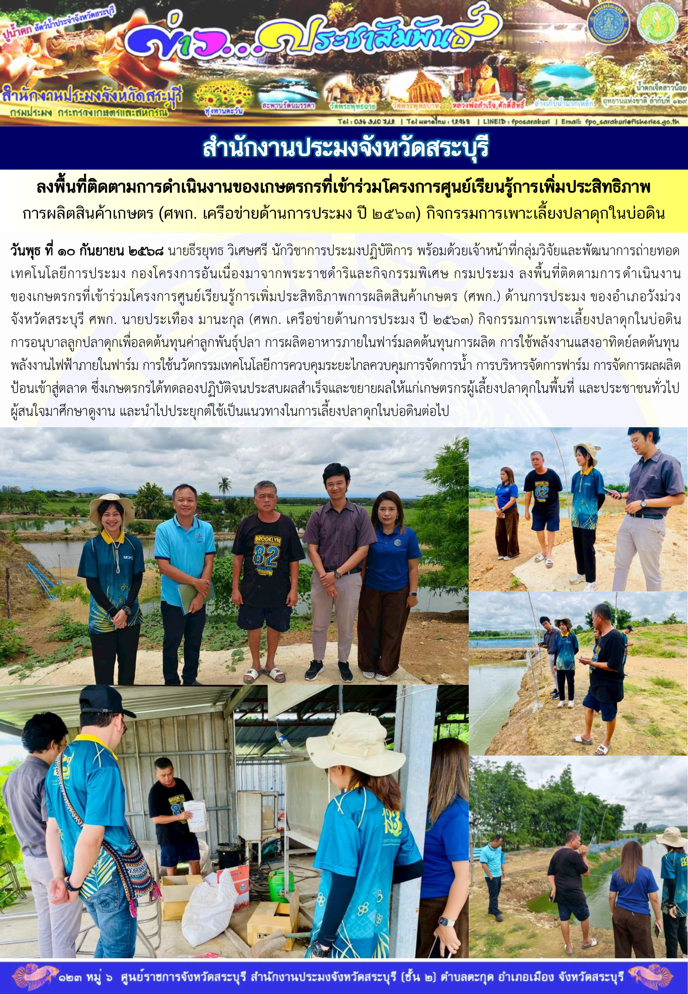 วันพุธ ที่ ๑๐ กันยายน ๒๕๖๘ นายธีรยุทธ วิเศษศรี นักวิชาการประมงปฏิบัติการ พร้อมด้วยเจ้าหน้าที่กลุ่มวิจัยและพัฒนาการถ่ายทอดเทคโนโลยีการประมง กองโครงการอันเนื่องมาจากพระราชดำริและกิจกรรมพิเศษ กรมประมง ลงพื้นที่ติดตามการดำเนินงานของเกษตรกรที่เข้าร่วมโครงการศูนย์เรียนรู้การเพิ่มประสิทธิภาพการผลิตสินค้าเกษตร (ศพก.) ด้านการประมง ของอำเภอวังม่วง จังหวัดสระบุรี ศพก. นายประเทือง มานะกุล (ศพก. เครือข่ายด้านการประมง ปี ๒๕๖๓) กิจกรรมการเพาะเลี้ยงปลาดุกในบ่อดิน การอนุบาลลูกปลาดุกเพื่อลดต้นทุนค่าลูกพันธุ์ปลา การผลิตอาหารภายในฟาร์มลดต้นทุนการผลิต การใช้พลังงานแสงอาทิตย์ลดต้นทุนพลังงานไฟฟ้าภายในฟาร์ม การใช้นวัตกรรมเทคโนโลยีการควบคุมระยะไกลควบคุมการจัดการน้ำ การบริหารจัดการฟาร์ม การจัดการผลผลิตป้อนเข้าสู่ตลาด ซึ่งเกษตรกรได้ทดลองปฏิบัติจนประสบผลสำเร็จและขยายผลให้แก่เกษตรกรผู้เลี้ยงปลาดุกในพื้นที่ และประชาชนทั่วไปผู้สนใจมาศึกษาดูงาน และนำไปประยุกต์ใช้เป็นแนวทางในการเลี้ยงปลาดุกในบ่อดินต่อไป