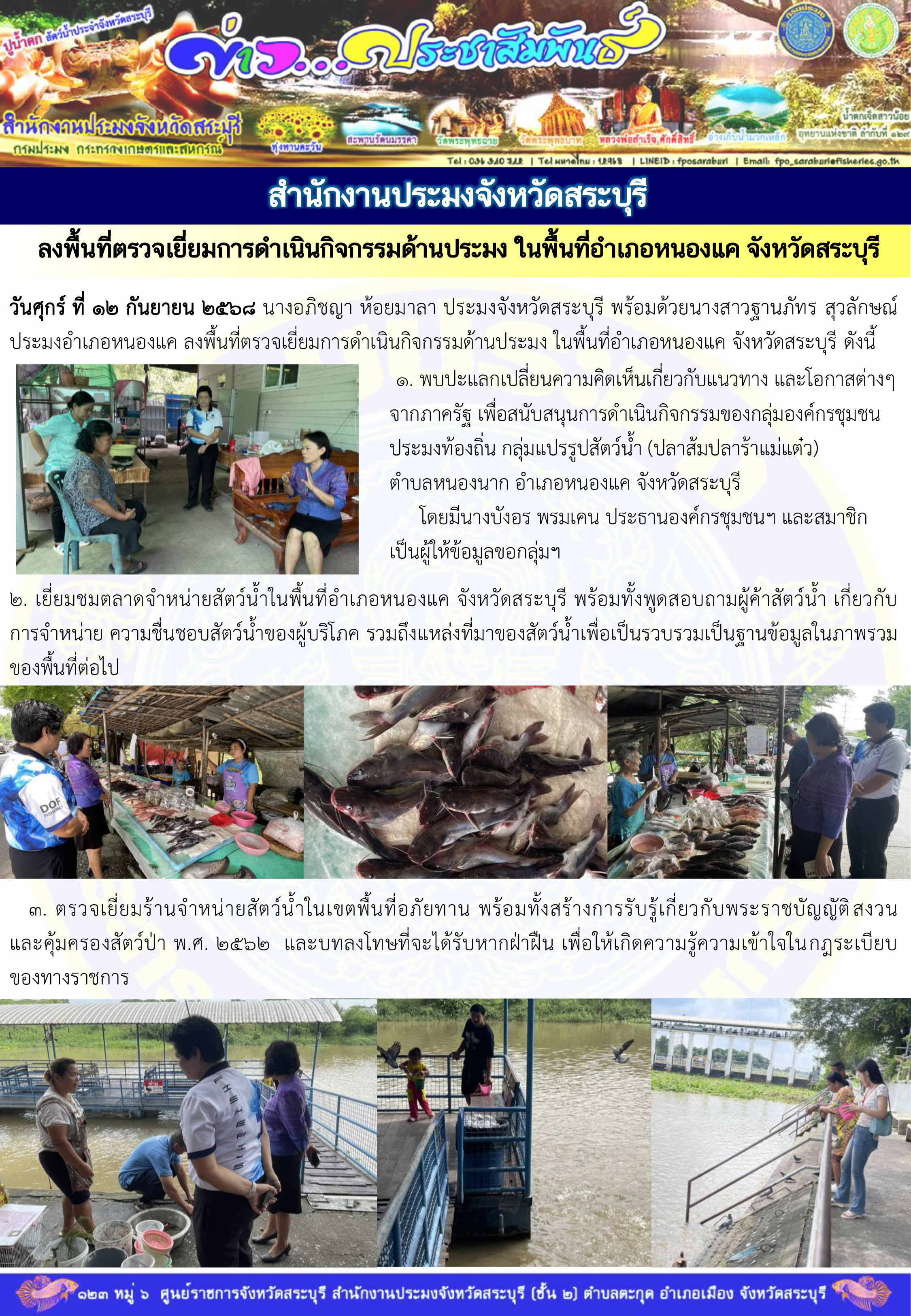ภารกิจประจำวันที่ 12 กันยายน 2568 สำนักงานประมงจังหวัดสระบุรี
