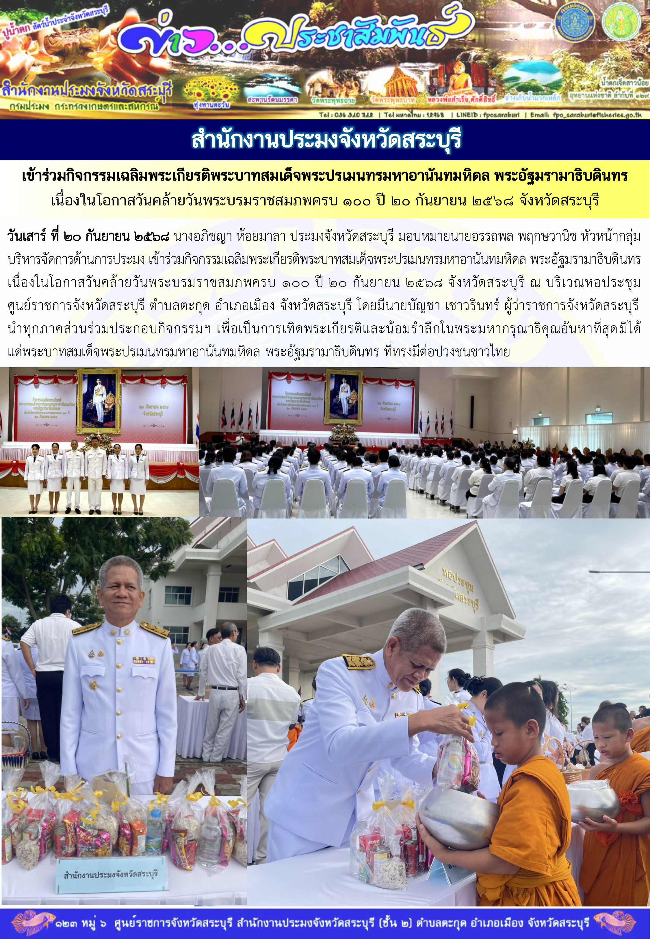 วันเสาร์ ที่ ๒๐ กันยายน ๒๕๖๘ นางอภิชญา ห้อยมาลา ประมงจังหวัดสระบุรี มอบหมายนายอรรถพล พฤกษวานิช หัวหน้ากลุ่มบริหารจัดการด้านการประมง เข้าร่วมกิจกรรมเฉลิมพระเกียรติพระบาทสมเด็จพระปรเมนทรมหาอานันทมหิดล พระอัฐมรามาธิบดินทร เนื่องในโอกาสวันคล้ายวันพระบรมราชสมภพครบ ๑๐๐ ปี ๒๐ กันยายน ๒๕๖๘ จังหวัดสระบุรี ณ บริเวณหอประชุมศูนย์ราชการจังหวัดสระบุรี ตำบลตะกุด อำเภอเมือง จังหวัดสระบุรี โดยมีนายบัญชา เชาวรินทร์ ผู้ว่าราชการจังหวัดสระบุรี นำทุกภาคส่วนร่วมประกอบกิจกรรมฯ เพื่อเป็นการเทิดพระเกียรติและน้อมรำลึกในพระมหากรุณาธิคุณอันหาที่สุดมิได้แด่พระบาทสมเด็จพระปรเมนทรมหาอานันทมหิดล พระอัฐมรามาธิบดินทร ที่ทรงมีต่อปวงชนชาวไทย