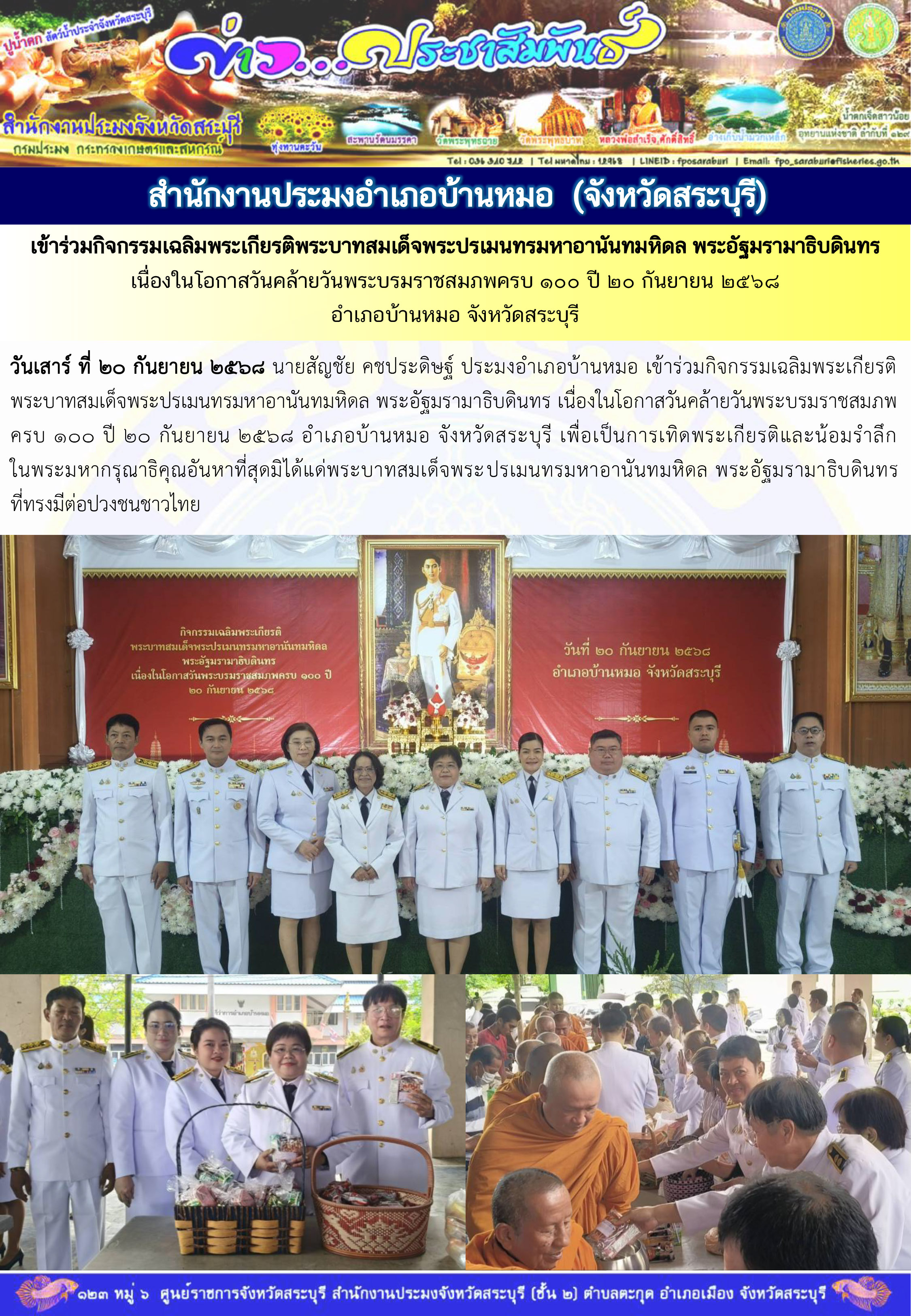 วันเสาร์ ที่ ๒๐ กันยายน ๒๕๖๘ นายสัญชัย คชประดิษฐ์ ประมงอำเภอบ้านหมอ เข้าร่วมกิจกรรมเฉลิมพระเกียรติพระบาทสมเด็จพระปรเมนทรมหาอานันทมหิดล พระอัฐมรามาธิบดินทร เนื่องในโอกาสวันคล้ายวันพระบรมราชสมภพครบ ๑๐๐ ปี ๒๐ กันยายน ๒๕๖๘ อำเภอบ้านหมอ จังหวัดสระบุรี เพื่อเป็นการเทิดพระเกียรติและน้อมรำลึกในพระมหากรุณาธิคุณอันหาที่สุดมิได้แด่พระบาทสมเด็จพระปรเมนทรมหาอานันทมหิดล พระอัฐมรามาธิบดินทร ที่ทรงมีต่อปวงชนชาวไทย