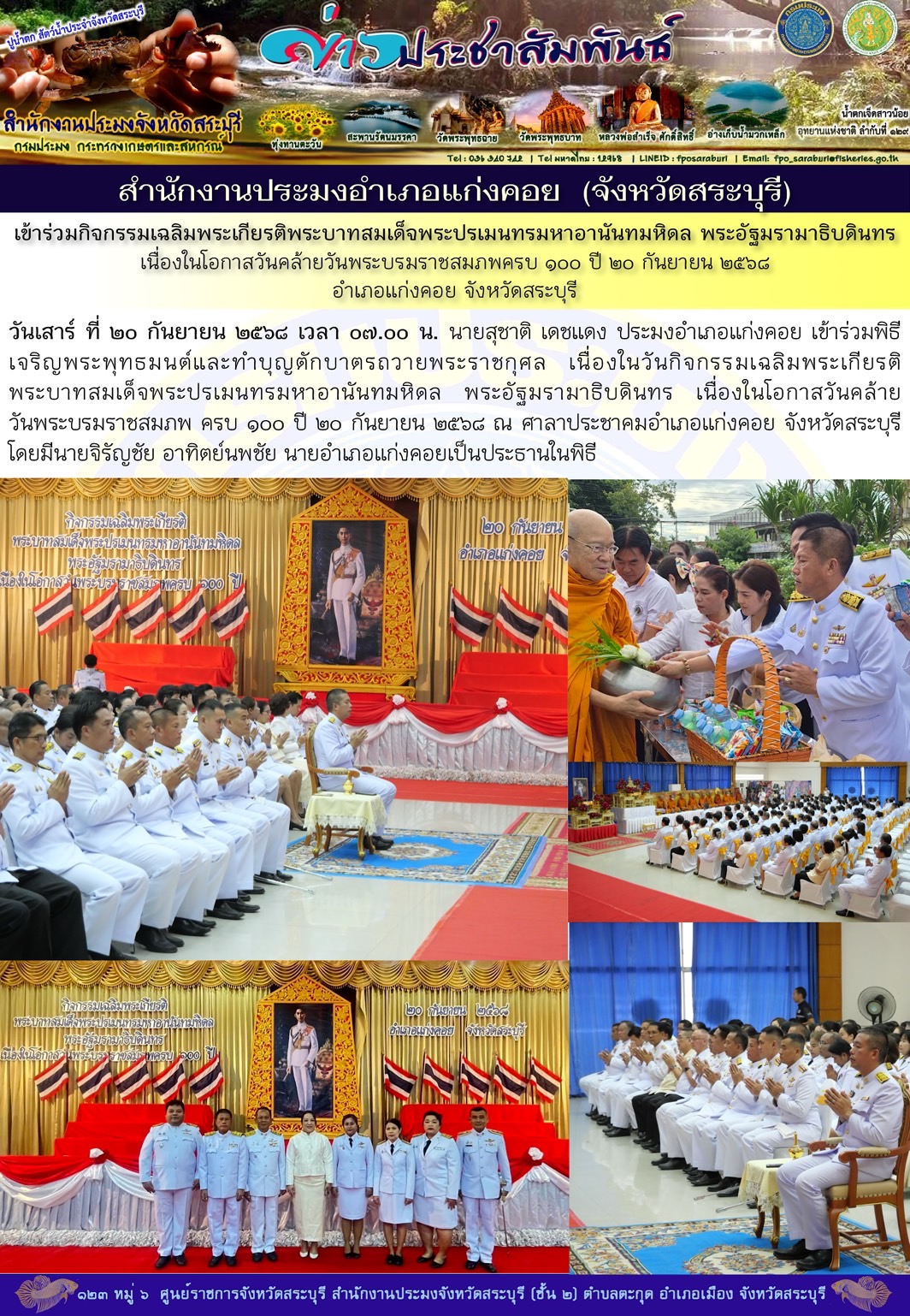นทร เนื่องในโอกาสวันคล้าย วันพระบรมราชสมภพ ครบ ๑๐๐ ปี ๒๐ กันยายน ๒๕๖๘ ณ ศาลาประชาคมอำเภอแก่งคอย จังหวัดสระบุรี โดยมีนายจิรัญชัย อาทิตย์นพชัย นายอำเภอแก่งคอยเป็นประธานในพิธี