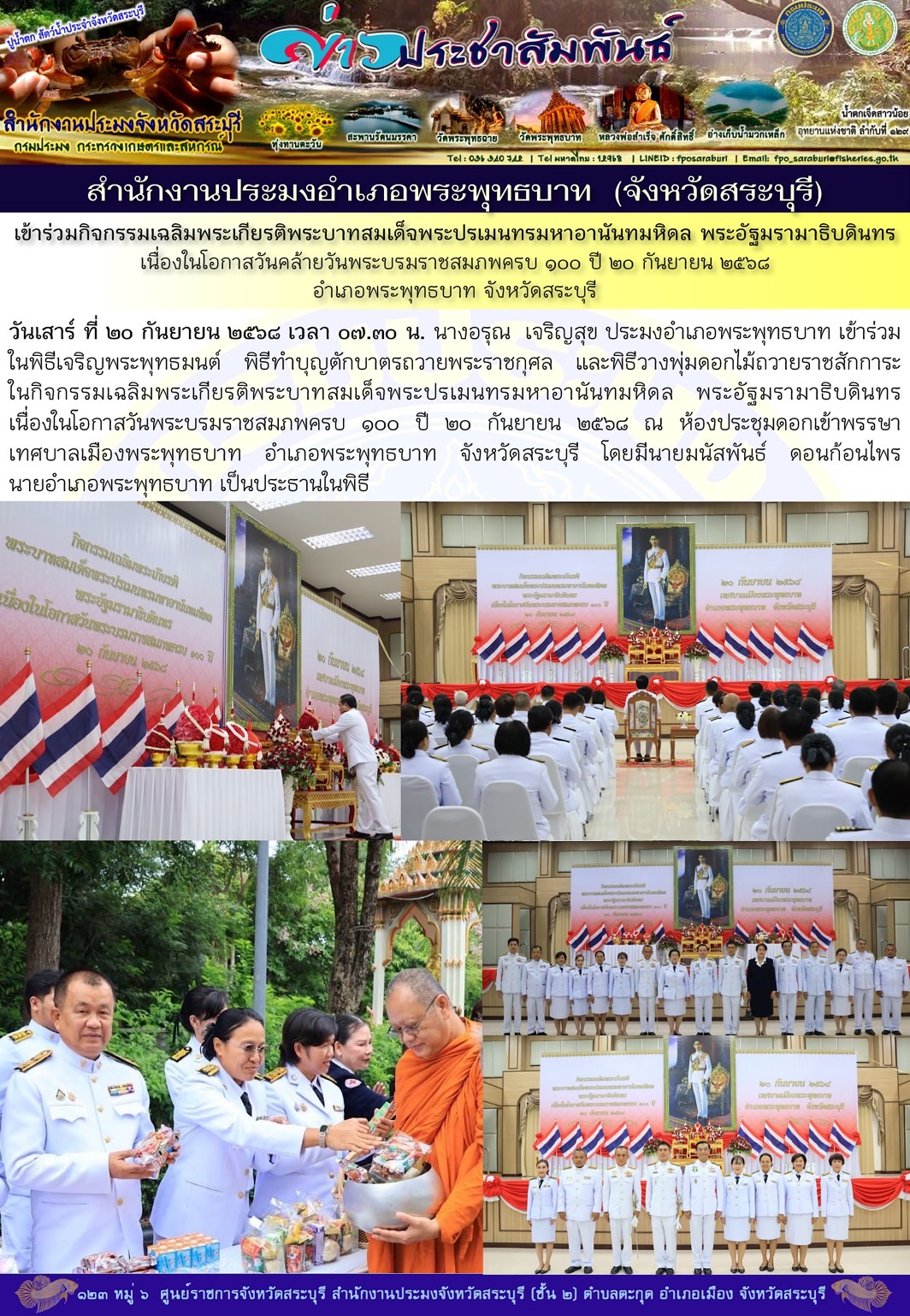 วันเสาร์ ที่ ๒๐ กันยายน ๒๕๖๘ เวลา ๐๗.๓๐ น. นางอรุณ เจริญสุข ประมงอำเภอพระพุทธบาท เข้าร่วมในพิธีเจริญพระพุทธมนต์ พิธีทำบุญตักบาตรถวายพระราชกุศล และพิธีวางพุ่มดอกไม้ถวายราชสักการะ ในกิจกรรมเฉลิมพระเกียรติพระบาทสมเด็จพระปรเมนทรมหาอานันทมหิดล พระอัฐมรามาธิบดินทร เนื่องในโอกาสวันพระบรมราชสมภพครบ ๑๐๐ ปี ๒๐ กันยายน ๒๕๖๘ ณ ห้องประชุมดอกเข้าพรรษา เทศบาลเมืองพระพุทธบาท อำเภอพระพุทธบาท จังหวัดสระบุรี โดยมีนายมนัสพันธ์ ดอนก้อนไพร นายอำเภอพระพุทธบาท เป็นประธานในพิธี