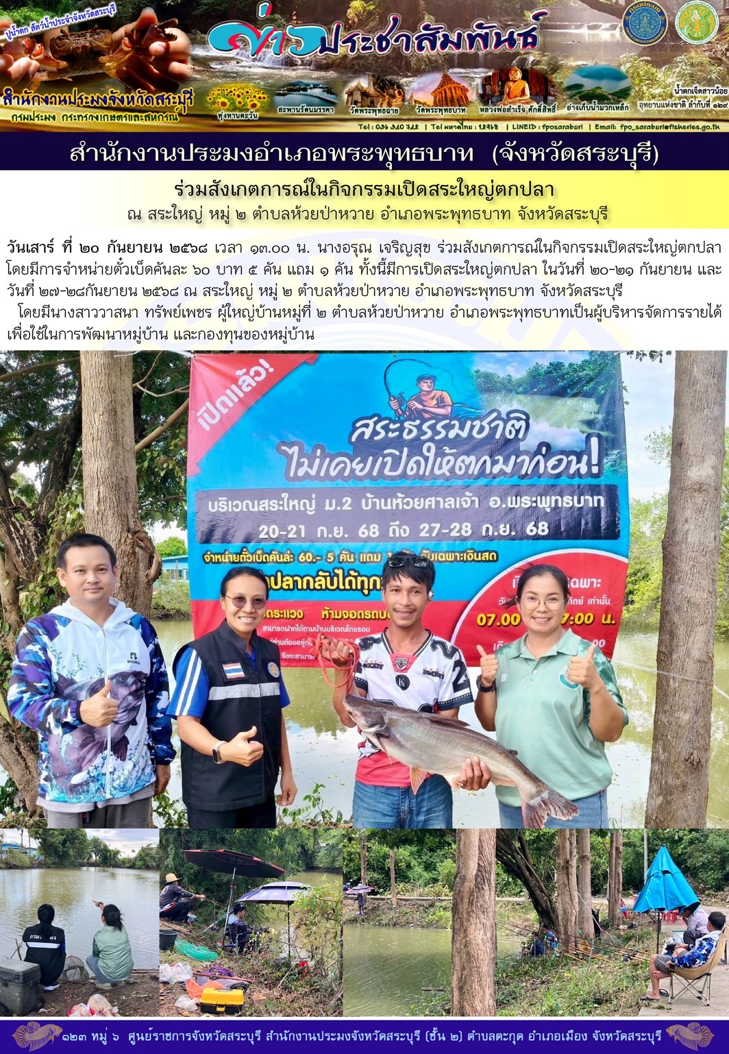 วันเสาร์ ที่ ๒๐ กันยายน ๒๕๖๘ เวลา ๑๓.๐๐ น. นางอรุณ เจริญสุข ร่วมสังเกตการณ์ในกิจกรรมเปิดสระใหญ่ตกปลา โดยมีการจำหน่ายตั๋วเบ็ดคันละ ๖๐ บาท ๕ คัน แถม ๑ คัน ทั้งนี้มีการเปิดสระใหญ่ตกปลา ในวันที่ ๒๐-๒๑ กันยายน และ วันที่ ๒๗-๒๘ กันยายน ๒๕๖๘ ณ สระใหญ่ หมู่ ๒ ตำบลห้วยป่าหวาย อำเภอพระพุทธบาท จังหวัดสระบุรี