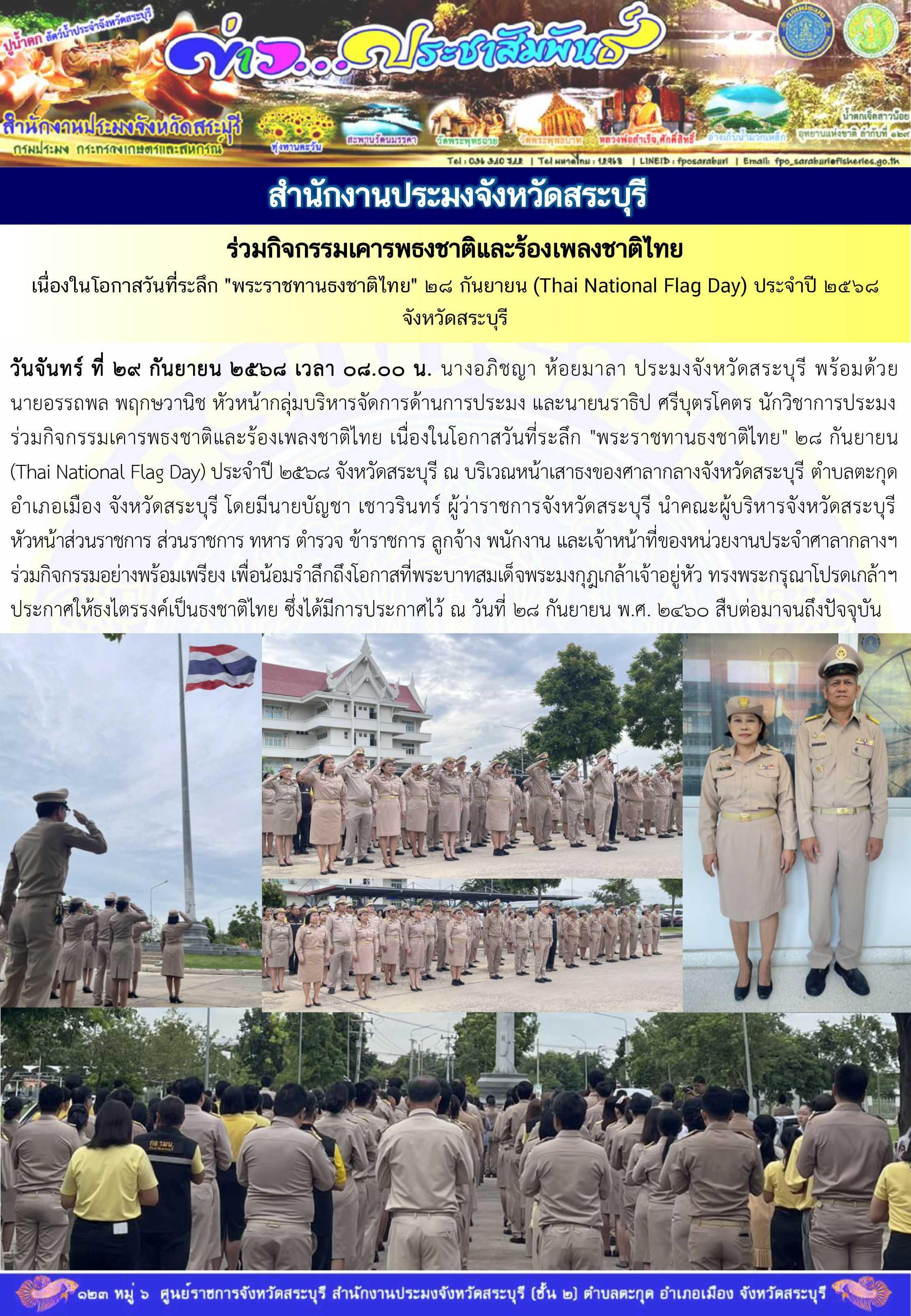 วันจันทร์ ที่ ๒๙ กันยายน ๒๕๖๘ เวลา ๐๘.๐๐ น. นางอภิชญา ห้อยมาลา ประมงจังหวัดสระบุรี พร้อมด้วยนายอรรถพล พฤกษวานิช หัวหน้ากลุ่มบริหารจัดการด้านการประมง และนายนราธิป ศรีบุตรโคตร นักวิชาการประมง ร่วมกิจกรรมเคารพธงชาติและร้องเพลงชาติไทย เนื่องในโอกาสวันที่ระลึก "พระราชทานธงชาติไทย" ๒๘ กันยายน (Thai National Flag Day) ประจำปี ๒๕๖๘ จังหวัดสระบุรี ณ บริเวณหน้าเสาธงของศาลากลางจังหวัดสระบุรี ตำบลตะกุด อำเภอเมือง จังหวัดสระบุรี โดยมีนายบัญชา เชาวรินทร์ ผู้ว่าราชการจังหวัดสระบุรี นำคณะผู้บริหารจังหวัดสระบุรี หัวหน้าส่วนราชการ ส่วนราชการ ทหาร ตำรวจ ข้าราชการ ลูกจ้าง พนักงาน และเจ้าหน้าที่ของหน่วยงานประจำศาลากลางฯ ร่วมกิจกรรมอย่างพร้อมเพรียง เพื่อน้อมรำลึกถึงโอกาสที่พระบาทสมเด็จพระมงกุฎเกล้าเจ้าอยู่หัว ทรงพระกรุณาโปรดเกล้าฯ ประกาศให้ธงไตรรงค์เป็นธงชาติไทย ซึ่งได้มีการประกาศไว้ ณ วันที่ ๒๘ กันยายน พ.ศ. ๒๔๖๐ สืบต่อมาจนถึงปัจจุบัน