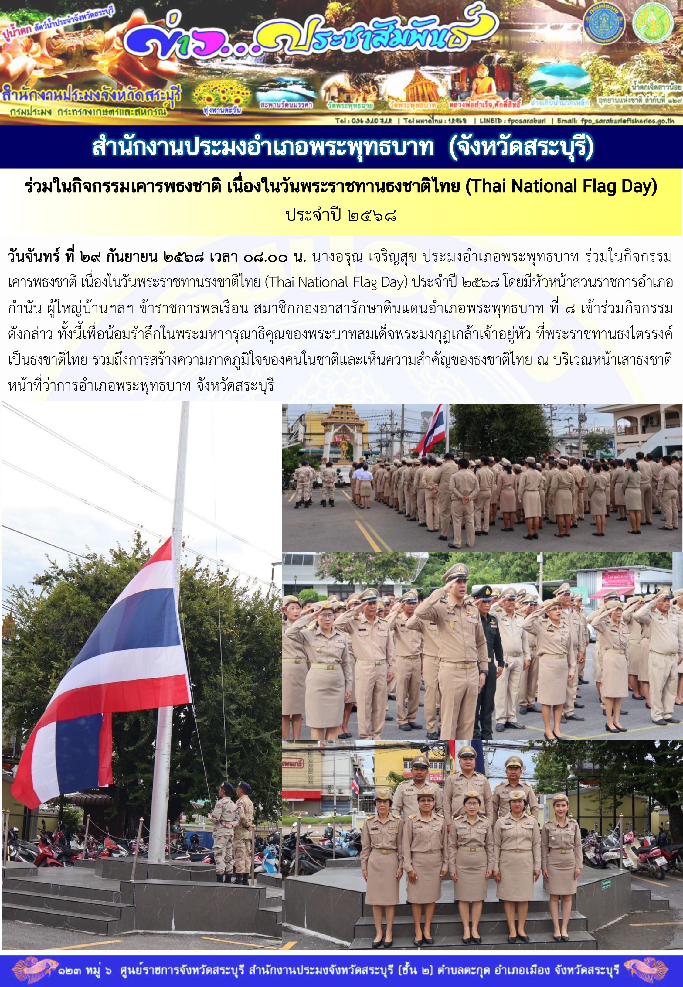 วันจันทร์ ที่ ๒๙ กันยายน ๒๕๖๘ เวลา ๐๘.๐๐ น. นางอรุณ เจริญสุข ประมงอำเภอพระพุทธบาท ร่วมในกิจกรรมเคารพธงชาติ เนื่องในวันพระราชทานธงชาติไทย (Thai National Flag Day) ประจำปี ๒๕๖๘ โดยมีหัวหน้าส่วนราชการอำเภอ กำนัน ผู้ใหญ่บ้านฯลฯ ข้าราชการพลเรือน สมาชิกกองอาสารักษาดินแดนอำเภอพระพุทธบาท ที่ ๘ เข้าร่วมกิจกรรมดังกล่าว ทั้งนี้เพื่อน้อมรำลึกในพระมหากรุณาธิคุณของพระบาทสมเด็จพระมงกุฎเกล้าเจ้าอยู่หัว ที่พระราชทานธงไตรรงค์ เป็นธงชาติไทย รวมถึงการสร้างความภาคภูมิใจของคนในชาติและเห็นความสำคัญของธงชาติไทย ณ บริเวณหน้าเสาธงชาติหน้าที่ว่าการอำเภอพระพุทธบาท จังหวัดสระบุรี