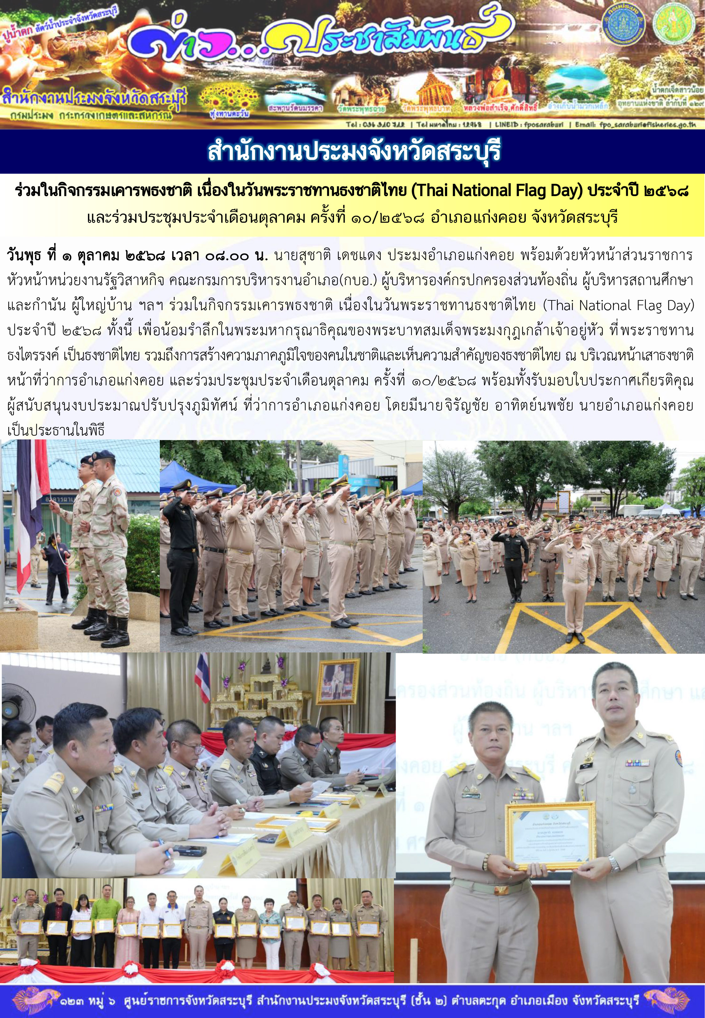 วันพุธ ที่ ๑ ตุลาคม ๒๕๖๘ เวลา ๐๘.๐๐ น. นายสุชาติ เดชแดง ประมงอำเภอแก่งคอย พร้อมด้วยหัวหน้าส่วนราชการ หัวหน้าหน่วยงานรัฐวิสาหกิจ คณะกรมการบริหารงานอำเภอ(กบอ.) ผู้บริหารองค์กรปกครองส่วนท้องถิ่น ผู้บริหารสถานศึกษา และกำนัน ผู้ใหญ่บ้าน ฯลฯ ร่วมในกิจกรรมเคารพธงชาติ เนื่องในวันพระราชทานธงชาติไทย (Thai National Flag Day) ประจำปี ๒๕๖๘ ทั้งนี้ เพื่อน้อมรำลึกในพระมหากรุณาธิคุณของพระบาทสมเด็จพระมงกุฎเกล้าเจ้าอยู่หัว ที่พระราชทานธงไตรรงค์ เป็นธงชาติไทย รวมถึงการสร้างความภาคภูมิใจของคนในชาติและเห็นความสำคัญของธงชาติไทย ณ บริเวณหน้าเสาธงชาติหน้าที่ว่าการอำเภอแก่งคอย และร่วมประชุมประจำเดือนตุลาคม ครั้งที่ ๑๐/๒๕๖๘ พร้อมทั้งรับมอบใบประกาศเกียรติคุณ ผู้สนับสนุนงบประมาณปรับปรุงภูมิทัศน์ ที่ว่าการอำเภอแก่งคอย โดยมีนายจิรัญชัย อาทิตย์นพชัย นายอำเภอแก่งคอย เป็นประธานในพิธี