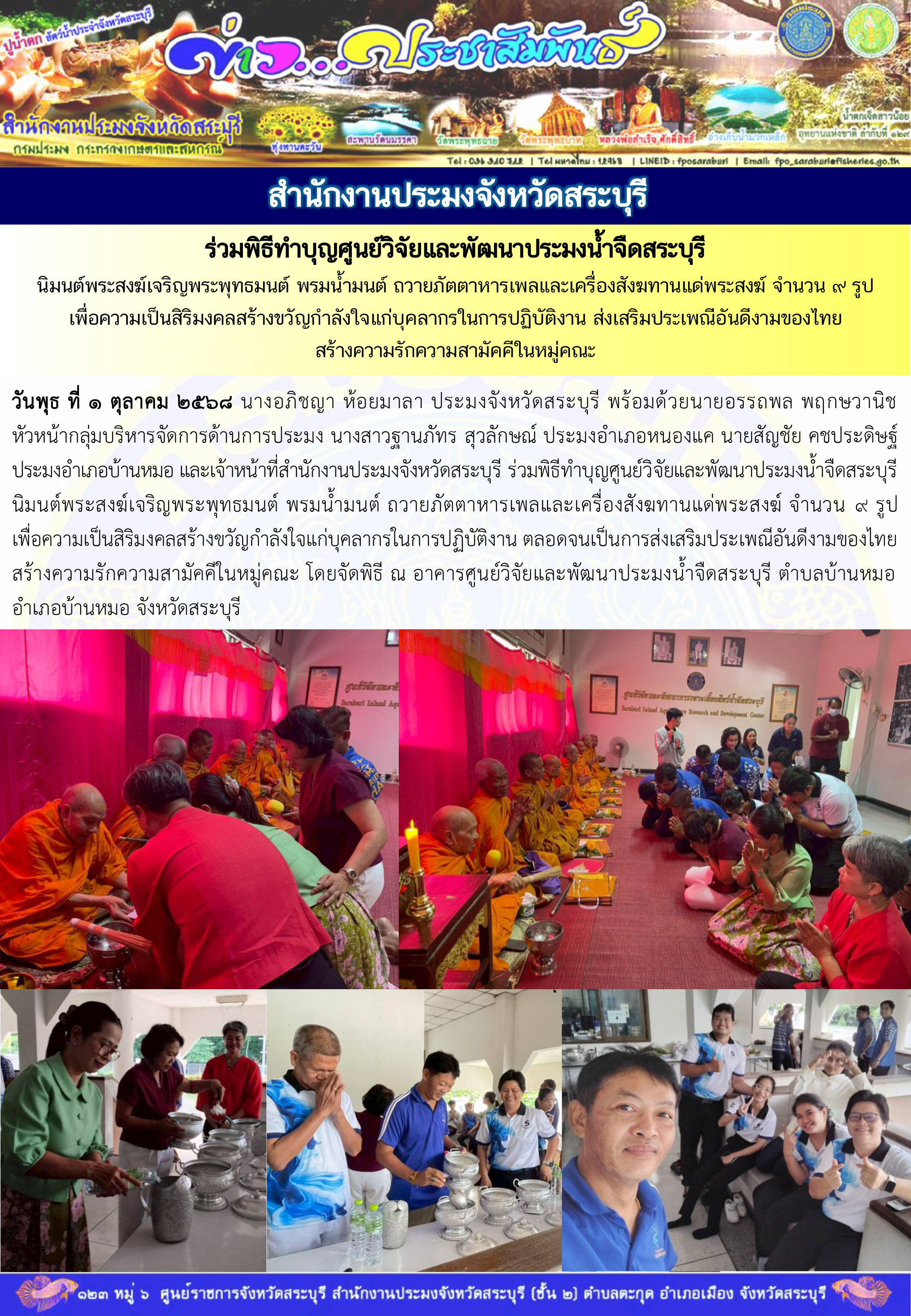 วันพุธ ที่ ๑ ตุลาคม ๒๕๖๘ นางอภิชญา ห้อยมาลา ประมงจังหวัดสระบุรี พร้อมด้วยนายอรรถพล พฤกษวานิช หัวหน้ากลุ่มบริหารจัดการด้านการประมง นางสาวฐานภัทร สุวลักษณ์ ประมงอำเภอหนองแค นายสัญชัย คชประดิษฐ์ ประมงอำเภอบ้านหมอ และเจ้าหน้าที่สำนักงานประมงจังหวัดสระบุรี ร่วมพิธีทำบุญศูนย์วิจัยและพัฒนาประมงน้ำจืดสระบุรี นิมนต์พระสงฆ์เจริญพระพุทธมนต์ พรมน้ำมนต์ ถวายภัตตาหารเพลและเครื่องสังฆทานแด่พระสงฆ์ จำนวน ๙ รูป เพื่อความเป็นสิริมงคลสร้างขวัญกำลังใจแก่บุคลากรในการปฏิบัติงาน ตลอดจนเป็นการส่งเสริมประเพณีอันดีงามของไทย สร้างความรักความสามัคคีในหมู่คณะ โดยจัดพิธี ณ อาคารศูนย์วิจัยและพัฒนาประมงน้ำจืดสระบุรี ตำบลบ้านหมอ อำเภอบ้านหมอ จังหวัดสระบุรี