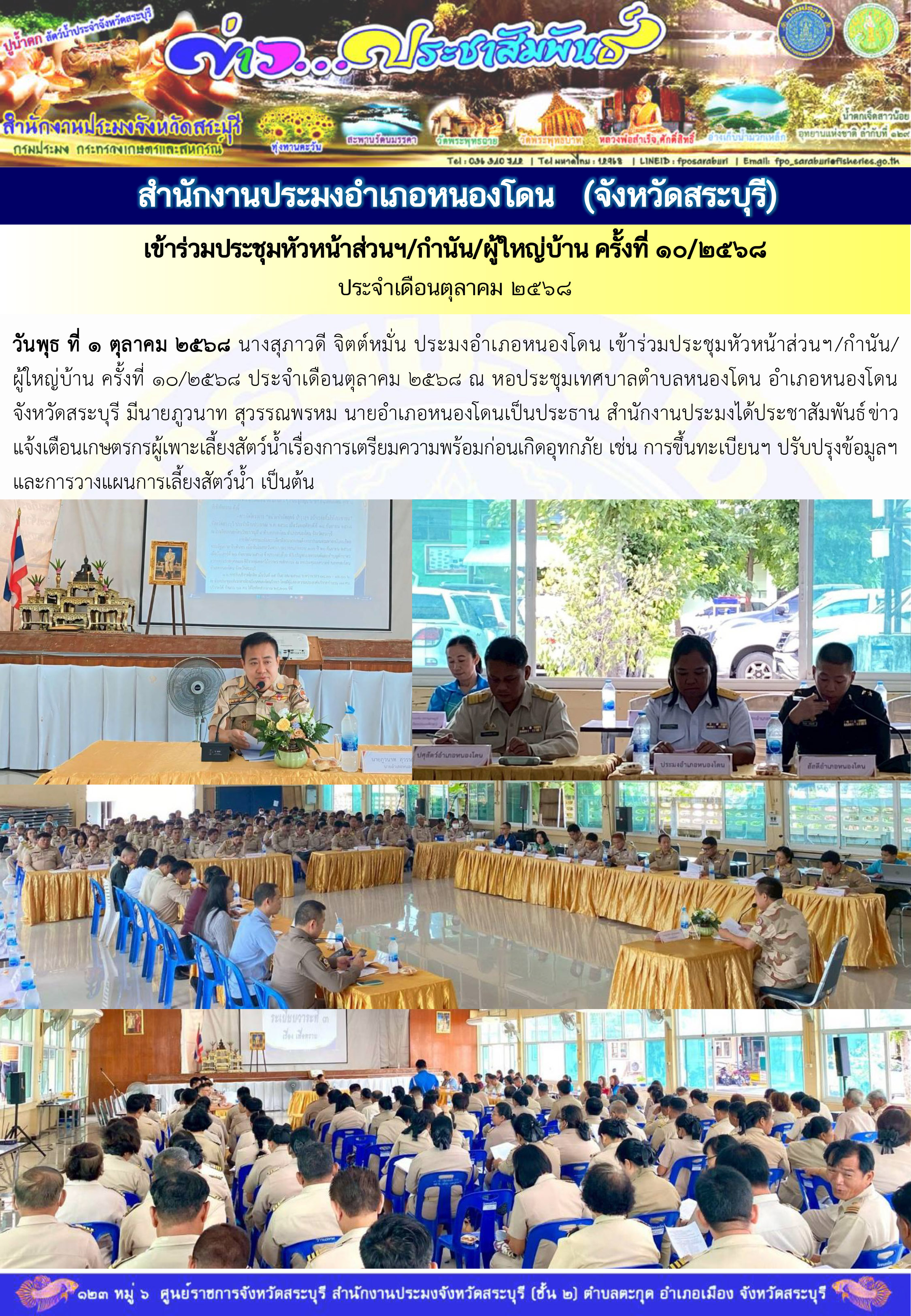 สำนักงานประมงอำเภอหนองโดน เข้าร่วมประชุมหัวหน้าส่วนฯ/กำนัน/ผู้ใหญ่บ้าน ครั้งที่ ๑๐/๒๕๖๘ ประจำเดือนตุลาคม ๒๕๖๘