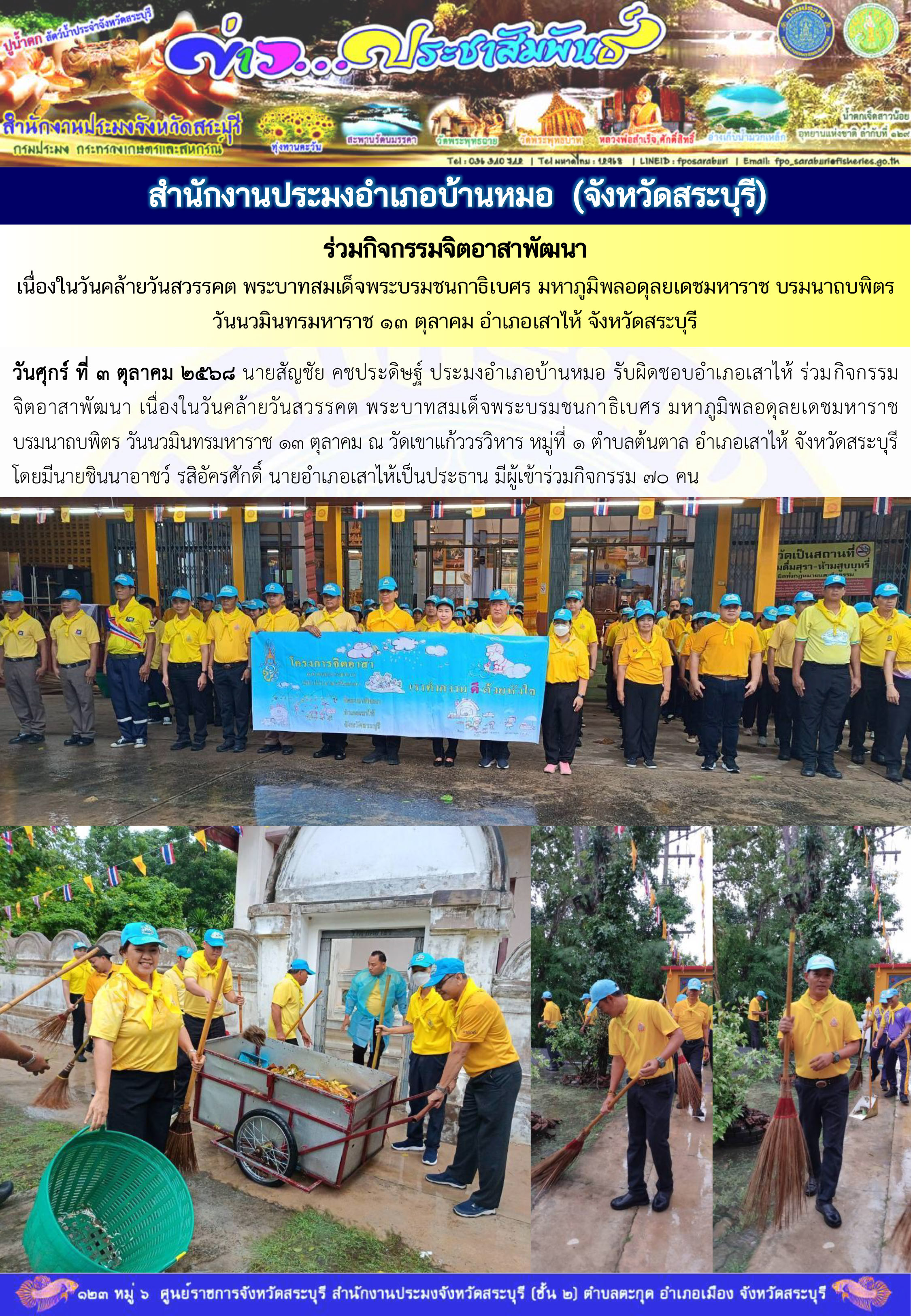 วันศุกร์ ที่ ๓ ตุลาคม ๒๕๖๘ นายสัญชัย คชประดิษฐ์ ประมงอำเภอบ้านหมอ รับผิดชอบอำเภอเสาไห้ ร่วมกิจกรรมจิตอาสาพัฒนา เนื่องในวันคล้ายวันสวรรคต พระบาทสมเด็จพระบรมชนกาธิเบศร มหาภูมิพลอดุลยเดชมหาราช บรมนาถบพิตร วันนวมินทรมหาราช ๑๓ ตุลาคม ณ วัดเขาแก้ววรวิหาร หมู่ที่ ๑ ตำบลต้นตาล อำเภอเสาไห้ จังหวัดสระบุรี โดยมีนายชินนาอาชว์ รสิอัครศักดิ์ นายอำเภอเสาไห้เป็นประธาน มีผู้เข้าร่วมกิจกรรม ๗๐ คน