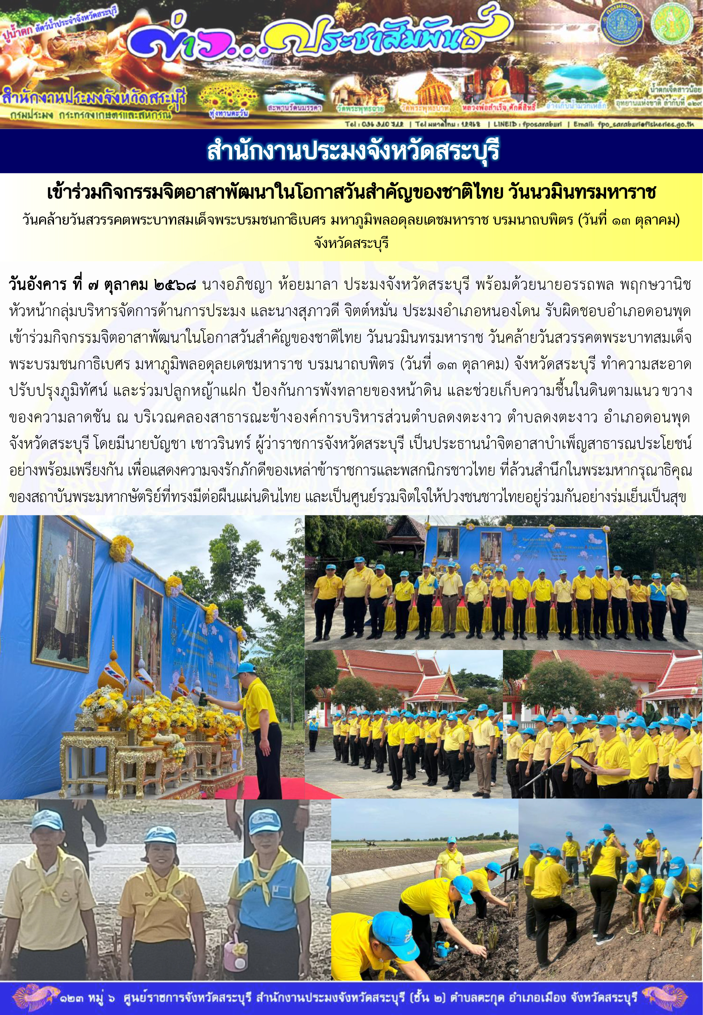 วันอังคาร ที่ ๗ ตุลาคม ๒๕๖๘ นางอภิชญา ห้อยมาลา ประมงจังหวัดสระบุรี พร้อมด้วยนายอรรถพล พฤกษวานิช หัวหน้ากลุ่มบริหารจัดการด้านการประมง และนางสุภาวดี จิตต์หมั่น ประมงอำเภอหนองโดน รับผิดชอบอำเภอดอนพุด เข้าร่วมกิจกรรมจิตอาสาพัฒนาในโอกาสวันสำคัญของชาติไทย วันนวมินทรมหาราช วันคล้ายวันสวรรคตพระบาทสมเด็จพระบรมชนกาธิเบศร มหาภูมิพลอดุลยเดชมหาราช บรมนาถบพิตร (วันที่ ๑๓ ตุลาคม) จังหวัดสระบุรี ทำความสะอาดปรับปรุงภูมิทัศน์ และร่วมปลูกหญ้าแฝก ป้องกันการพังทลายของหน้าดิน และช่วยเก็บความชื้นในดินตามแนวขวางของความลาดชัน ณ บริเวณคลองสาธารณะข้างองค์การบริหารส่วนตำบลดงตะงาว ตำบลดงตะงาว อำเภอดอนพุด จังหวัดสระบุรี โดยมีนายบัญชา เชาวรินทร์ ผู้ว่าราชการจังหวัดสระบุรี เป็นประธานนำจิตอาสาบำเพ็ญสาธารณประโยชน์อย่างพร้อมเพรียงกัน เพื่อแสดงความจงรักภักดีของเหล่าข้าราชการและพสกนิกรชาวไทย ที่ล้วนสำนึกในพระมหากรุณาธิคุณของสถาบันพระมหากษัตริย์ที่ทรงมีต่อผืนแผ่นดินไทย และเป็นศูนย์รวมจิตใจให้ปวงชนชาวไทยอยู่ร่วมกันอย่างร่มเย็นเป็นสุข