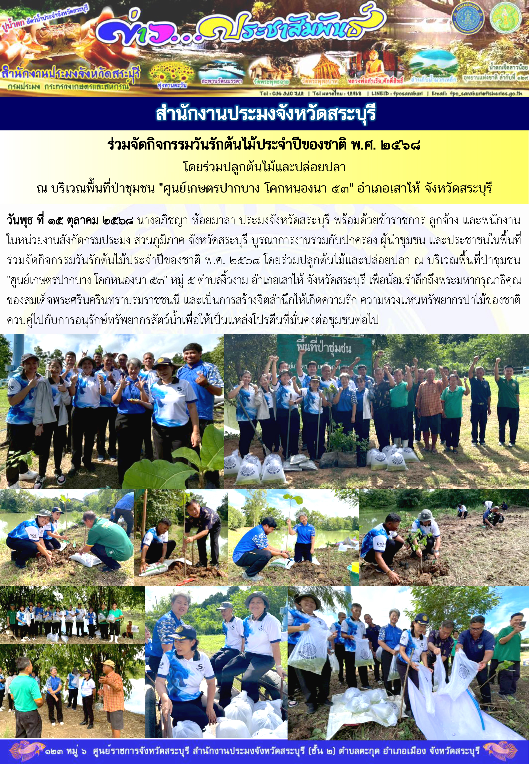 สำนักงานประมงจังหวัดสระบุรี ร่วมจัดกิจกรรมวันรักต้นไม้ประจำปีของชาติ พ.ศ. ๒๕๖๘ โดยร่วมปลูกต้นไม้และปล่อยปลา ณ บริเวณพื้นที่ป่าชุมชน "ศูนย์เกษตรปากบาง โคกหนองนา ๕๓" หมู่ ๕ ตำบลงิ้วงาม อำเภอเสาไห้ จังหวัดสระบุรี
