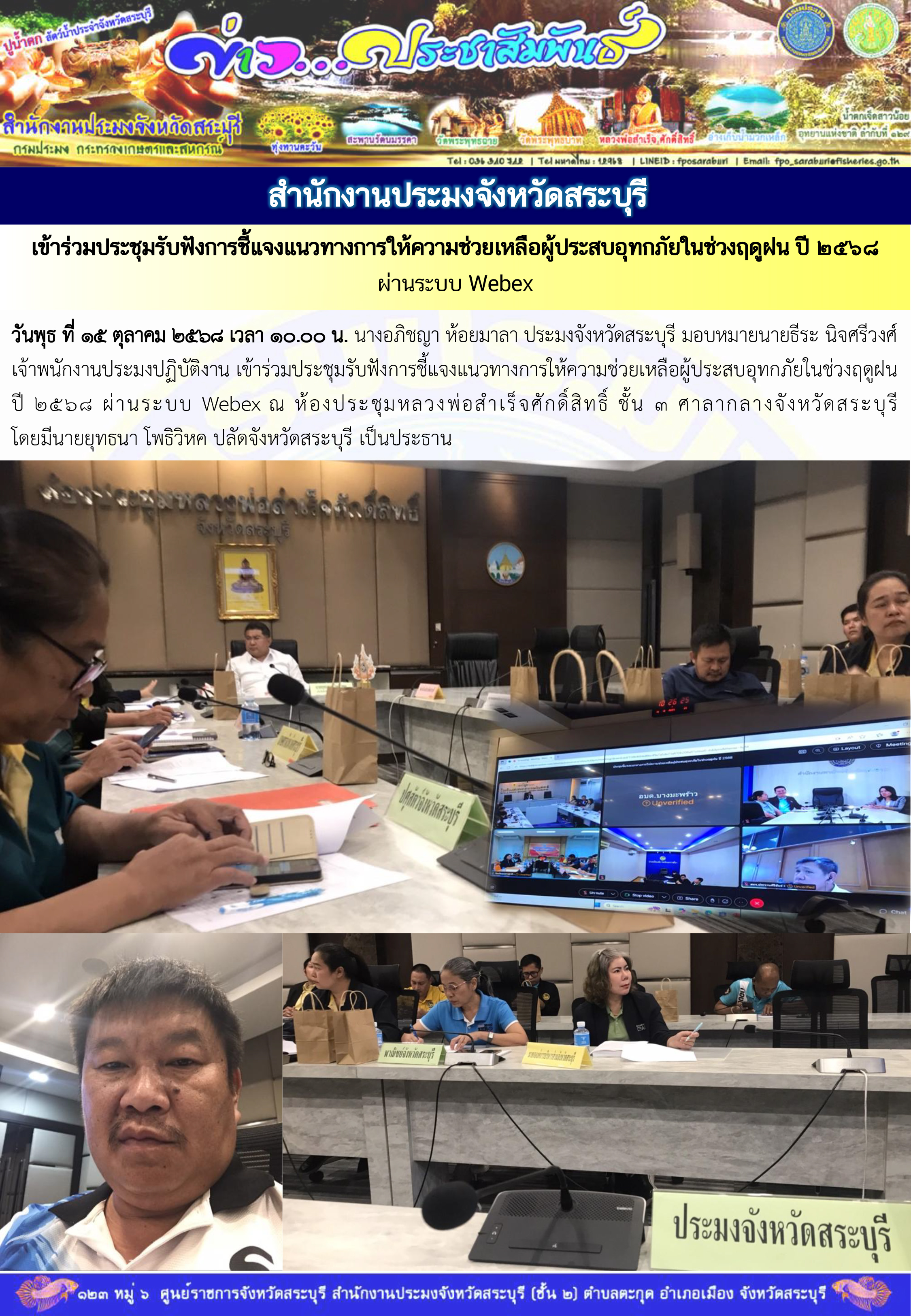 วันพุธ ที่ ๑๕ ตุลาคม ๒๕๖๘ เวลา ๑๐.๐๐ น. นางอภิชญา ห้อยมาลา ประมงจังหวัดสระบุรี มอบหมายนายธีระ นิจศรีวงศ์ เจ้าพนักงานประมงปฏิบัติงาน เข้าร่วมประชุมรับฟังการชี้แจงแนวทางการให้ความช่วยเหลือผู้ประสบอุทกภัยในช่วงฤดูฝน ปี ๒๕๖๘ ผ่านระบบ Webex ณ ห้องประชุมหลวงพ่อสำเร็จศักดิ์สิทธิ์ ชั้น ๓ ศาลากลางจังหวัดสระบุรี โดยมีนายยุทธนา โพธิวิหค ปลัดจังหวัดสระบุรี เป็นประธาน