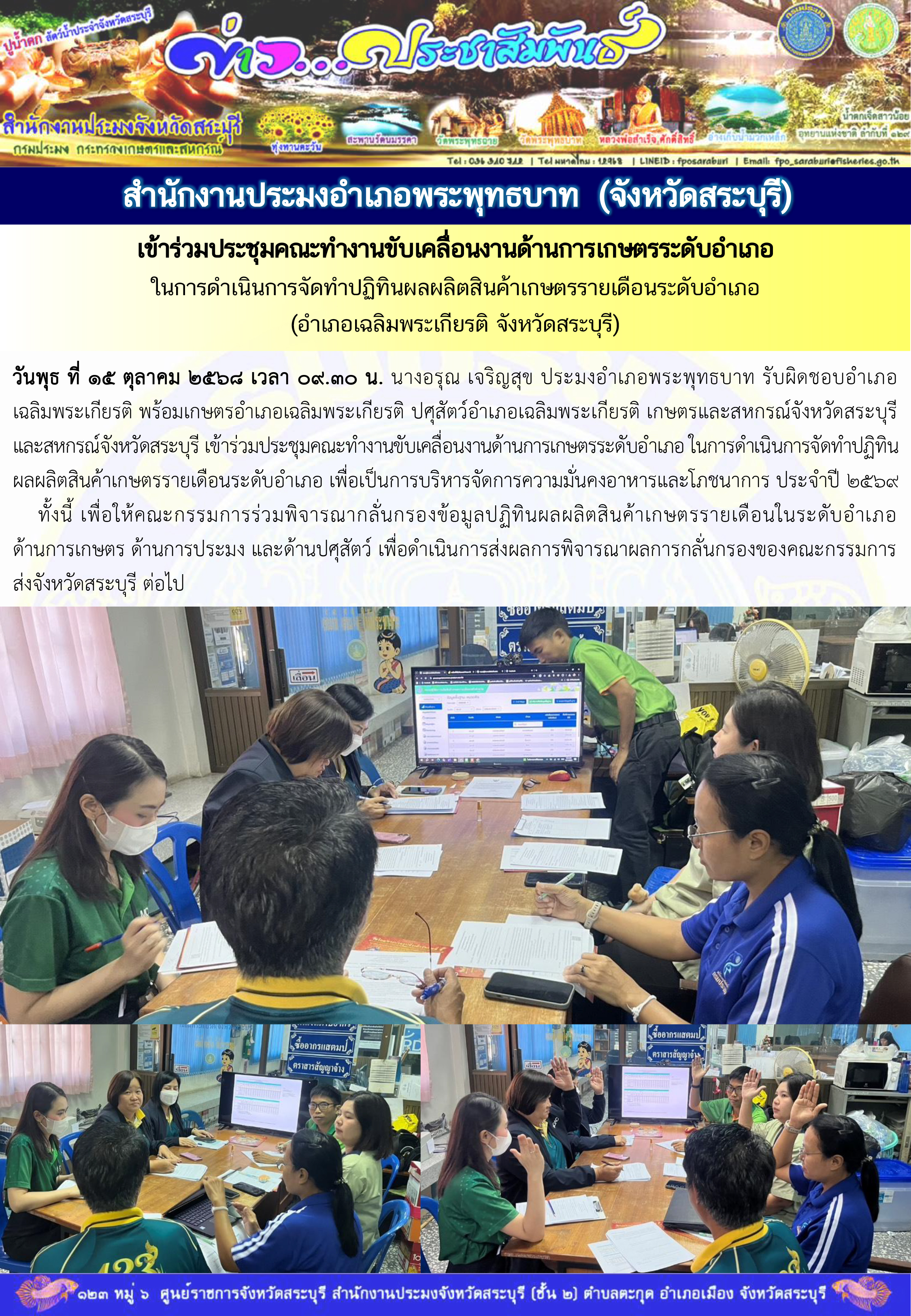 วันพุธ ที่ ๑๕ ตุลาคม ๒๕๖๘ เวลา ๐๙.๓๐ น. นางอรุณ เจริญสุข ประมงอำเภอพระพุทธบาท รับผิดชอบอำเภอเฉลิมพระเกียรติ พร้อมเกษตรอำเภอเฉลิมพระเกียรติ ปศุสัตว์อำเภอเฉลิมพระเกียรติ เกษตรและสหกรณ์จังหวัดสระบุรี และสหกรณ์จังหวัดสระบุรี เข้าร่วมประชุมคณะทำงานขับเคลื่อนงานด้านการเกษตรระดับอำเภอ ในการดำเนินการจัดทำปฏิทินผลผลิตสินค้าเกษตรรายเดือนระดับอำเภอ เพื่อเป็นการบริหารจัดการความมั่นคงอาหารและโภชนาการ ประจำปี ๒๕๖๙