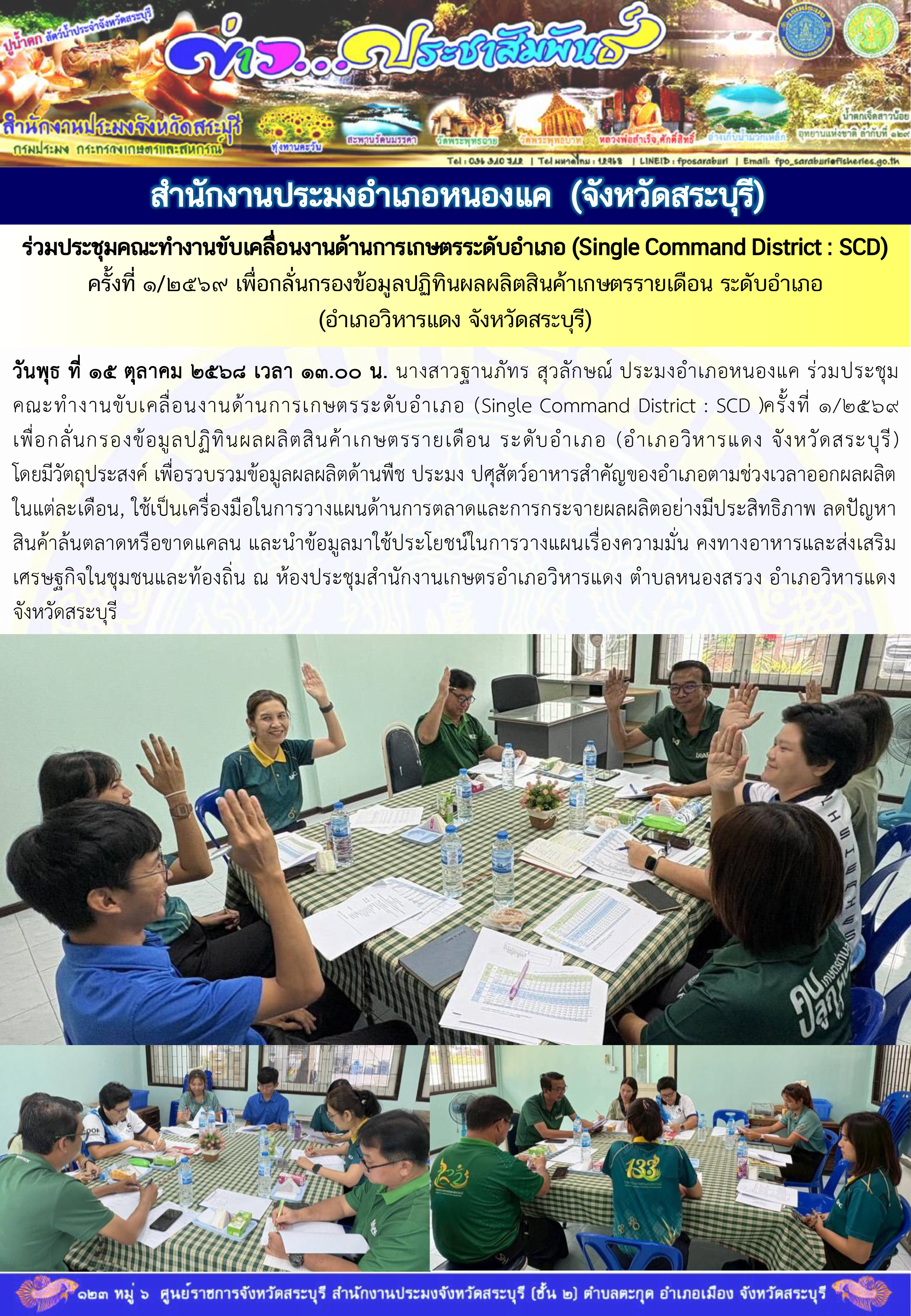 สำนักงานประมงอำเภอหนองแค ร่วมประชุมคณะทำงานขับเคลื่อนงานด้านการเกษตรระดับอำเภอ (Single Command District : SCD)ครั้งที่ ๑/๒๕๖๙ เพื่อกลั่นกรองข้อมูลปฏิทินผลผลิตสินค้าเกษตรรายเดือน ระดับอำเภอ (อำเภอวิหารแดง จังหวัดสระบุรี)