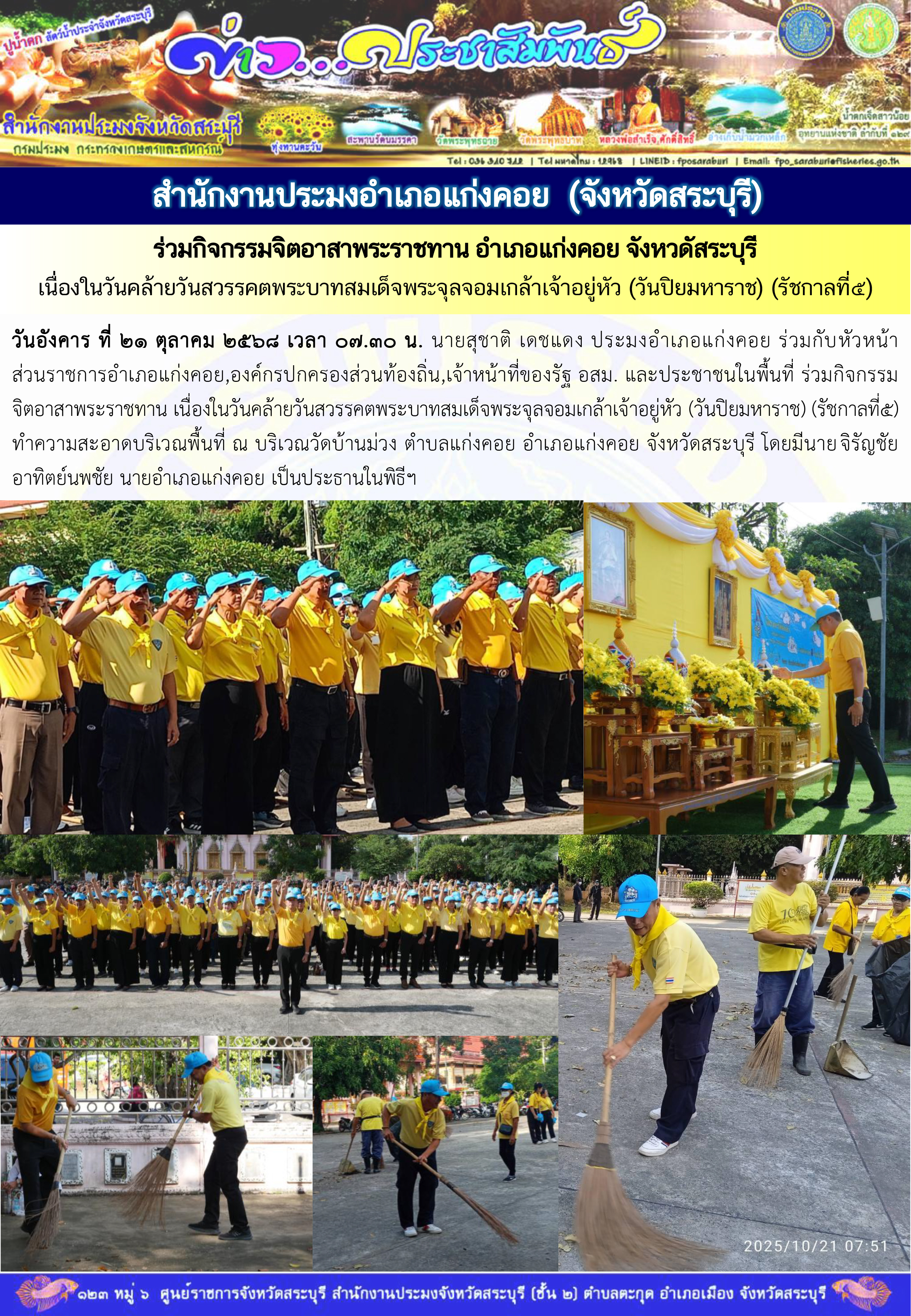 วันอังคาร ที่ ๒๑ ตุลาคม ๒๕๖๘ เวลา ๐๗.๓๐ น. นายสุชาติ เดชแดง ประมงอำเภอแก่งคอย ร่วมกับหัวหน้าส่วนราชการอำเภอแก่งคอย,องค์กรปกครองส่วนท้องถิ่น,เจ้าหน้าที่ของรัฐ อสม. และประชาชนในพื้นที่ ร่วมกิจกรรมจิตอาสาพระราชทาน เนื่องในวันคล้ายวันสวรรคตพระบาทสมเด็จพระจุลจอมเกล้าเจ้าอยู่หัว (วันปิยมหาราช) (รัชกาลที่๕) ทำความสะอาดบริเวณพื้นที่ ณ บริเวณวัดบ้านม่วง ตำบลแก่งคอย อำเภอแก่งคอย จังหวัดสระบุรี โดยมีนายจิรัญชัย อาทิตย์นพชัย นายอำเภอแก่งคอย เป็นประธานในพิธีฯ