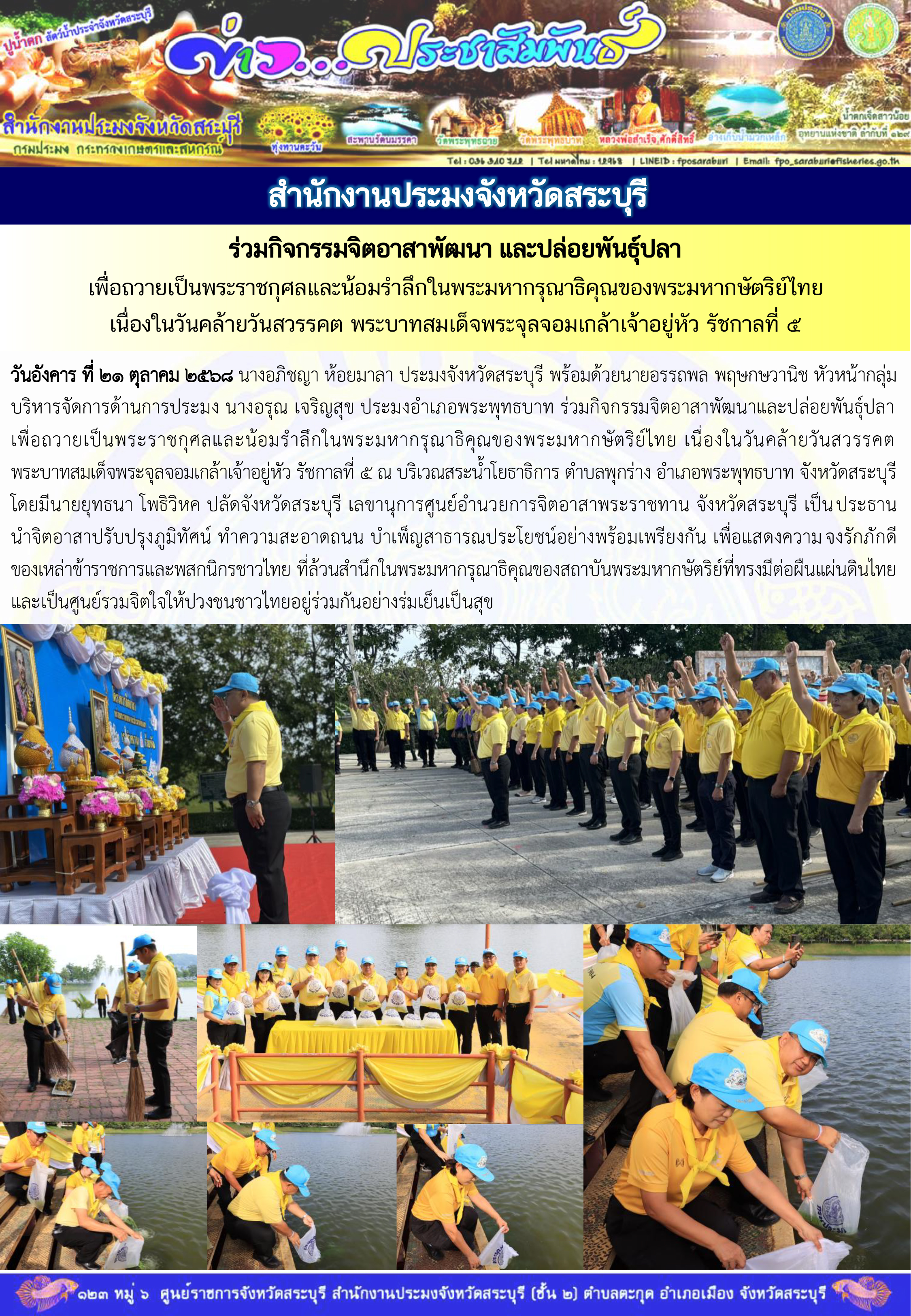 วันอังคาร ที่ ๒๑ ตุลาคม ๒๕๖๘ นางอภิชญา ห้อยมาลา ประมงจังหวัดสระบุรี พร้อมด้วยนายอรรถพล พฤกษวานิช หัวหน้ากลุ่มบริหารจัดการด้านการประมง นางอรุณ เจริญสุข ประมงอำเภอพระพุทธบาท ร่วมกิจกรรมจิตอาสาพัฒนาและปล่อยพันธุ์ปลา เพื่อถวายเป็นพระราชกุศลและน้อมรำลึกในพระมหากรุณาธิคุณของพระมหากษัตริย์ไทย เนื่องในวันคล้ายวันสวรรคต พระบาทสมเด็จพระจุลจอมเกล้าเจ้าอยู่หัว รัชกาลที่ ๕ ณ บริเวณสระน้ำโยธาธิการ ตำบลพุกร่าง อำเภอพระพุทธบาท จังหวัดสระบุรี โดยมีนายยุทธนา โพธิวิหค ปลัดจังหวัดสระบุรี เลขานุการศูนย์อำนวยการจิตอาสาพระราชทาน จังหวัดสระบุรี เป็นประธานนำจิตอาสาปรับปรุงภูมิทัศน์ ทำความสะอาดถนน บำเพ็ญสาธารณประโยชน์อย่างพร้อมเพรียงกัน เพื่อแสดงความจงรักภักดีของเหล่าข้าราชการและพสกนิกรชาวไทย ที่ล้วนสำนึกในพระมหากรุณาธิคุณของสถาบันพระมหากษัตริย์ที่ทรงมีต่อผืนแผ่นดินไทย และเป็นศูนย์รวมจิตใจให้ปวงชนชาวไทยอยู่ร่วมกันอย่างร่มเย็นเป็นสุข