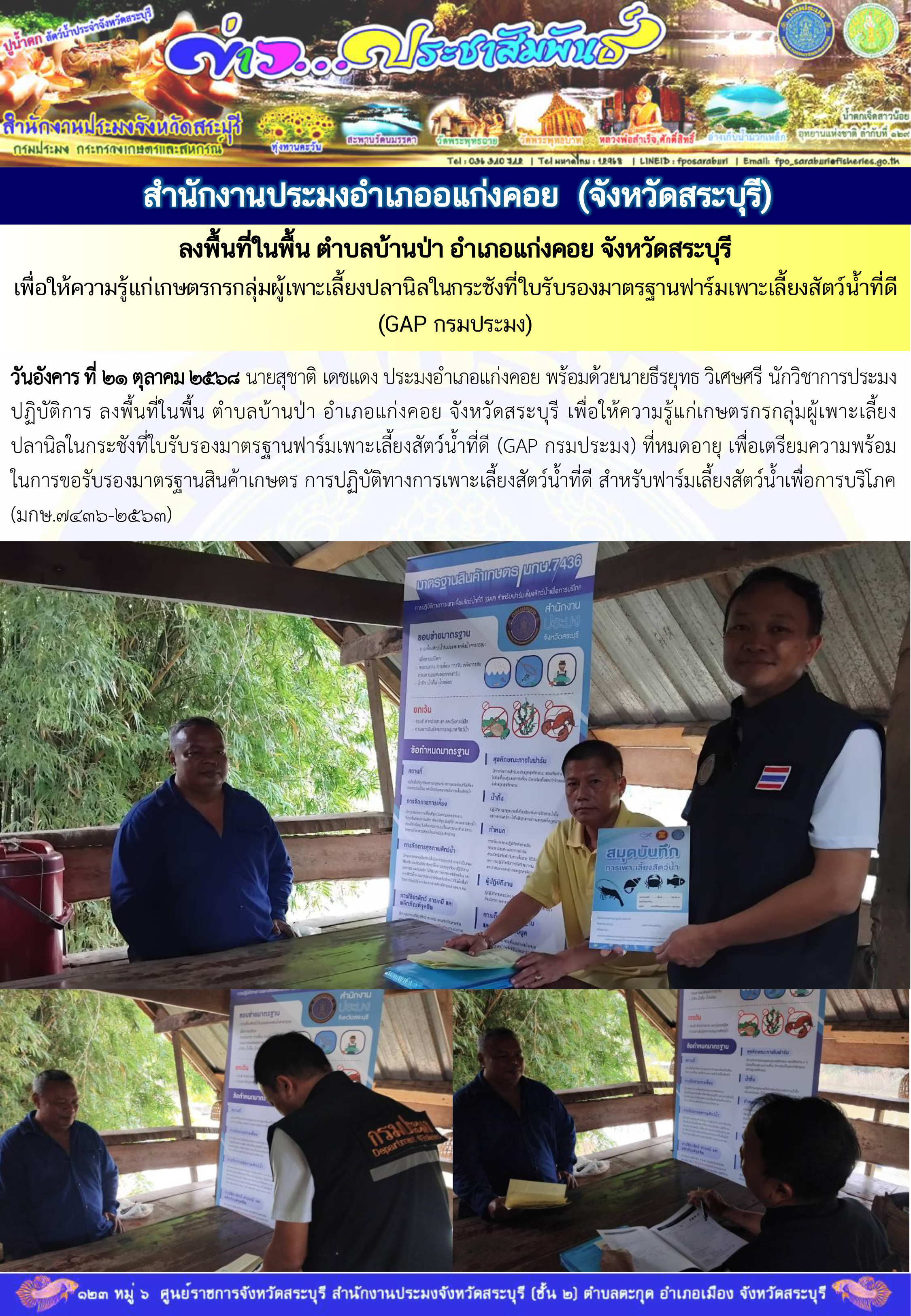 วันอังคาร ที่ ๒๑ ตุลาคม ๒๕๖๘ นายสุชาติ เดชแดง ประมงอำเภอแก่งคอย พร้อมด้วยนายธีรยุทธ วิเศษศรี นักวิชาการประมงปฏิบัติการ ลงพื้นที่ในพื้น ตำบลบ้านป่า อำเภอแก่งคอย จังหวัดสระบุรี เพื่อให้ความรู้แก่เกษตรกรกลุ่มผู้เพาะเลี้ยงปลานิลในกระชังที่ใบรับรองมาตรฐานฟาร์มเพาะเลี้ยงสัตว์น้ำที่ดี (GAP กรมประมง) ที่หมดอายุ เพื่อเตรียมความพร้อมในการขอรับรองมาตรฐานสินค้าเกษตร การปฏิบัติทางการเพาะเลี้ยงสัตว์น้ำที่ดี สำหรับฟาร์มเลี้ยงสัตว์น้ำเพื่อการบริโภค (มกษ.7436-2563)