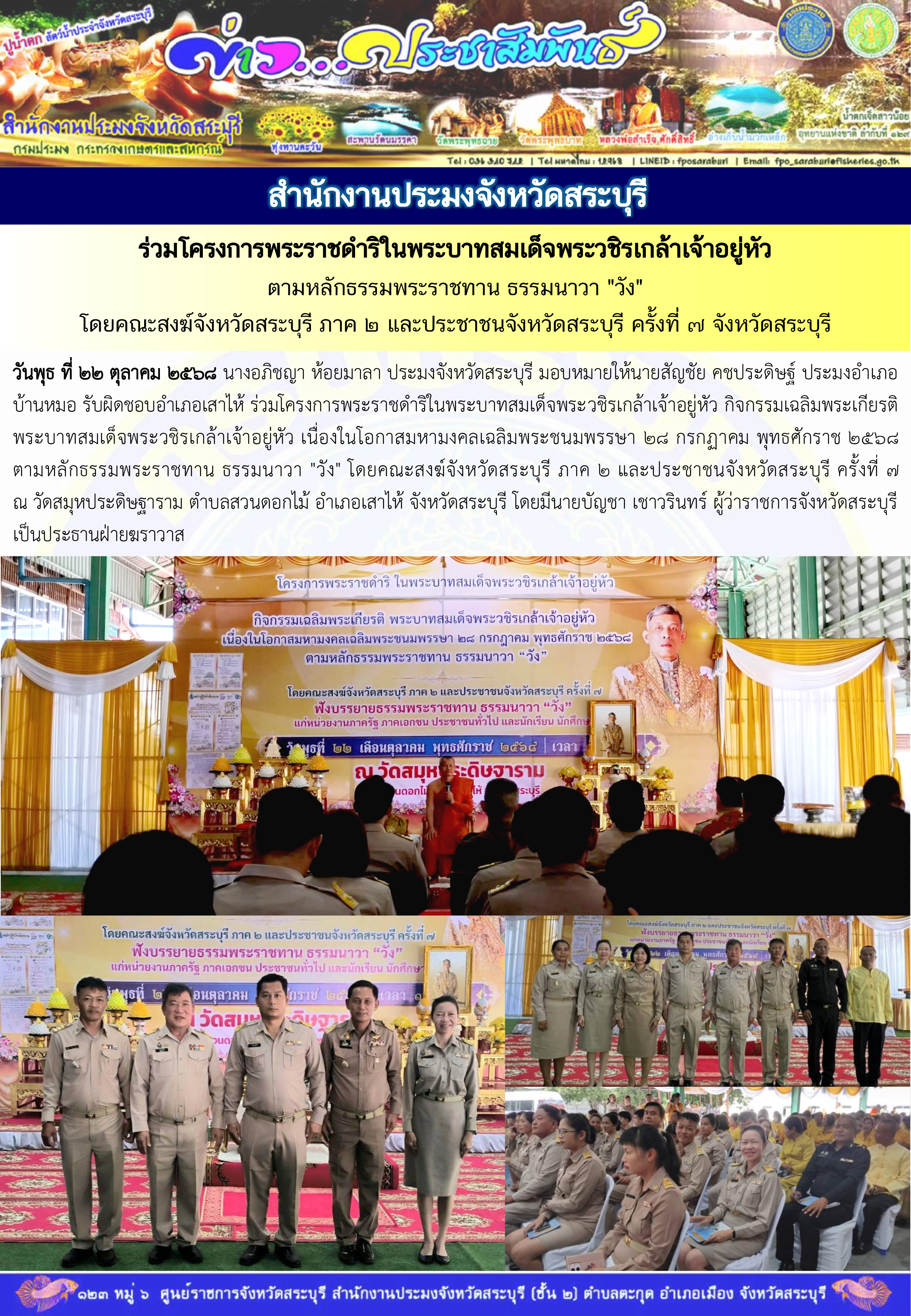 สำนักงานประมงจังหวัดสระบุรี ร่วมโครงการพระราชดำริในพระบาทสมเด็จพระวชิรเกล้าเจ้าอยู่หัว ตามหลักธรรมพระราชทาน ธรรมนาวา "วัง" โดยคณะสงฆ์จังหวัดสระบุรี ภาค ๒ และประชาชนจังหวัดสระบุรี ครั้งที่ ๗ จังหวัดสระบุรี