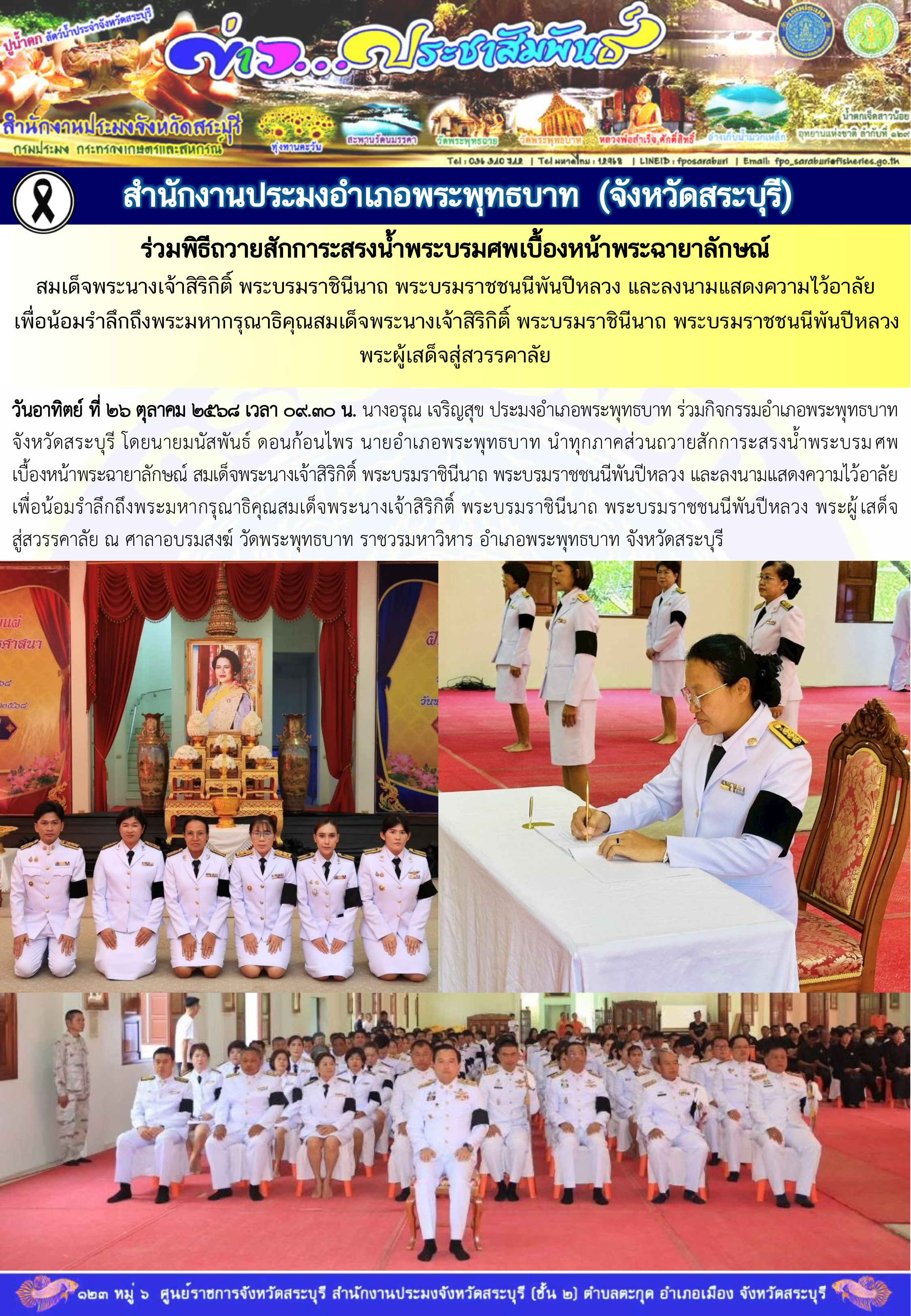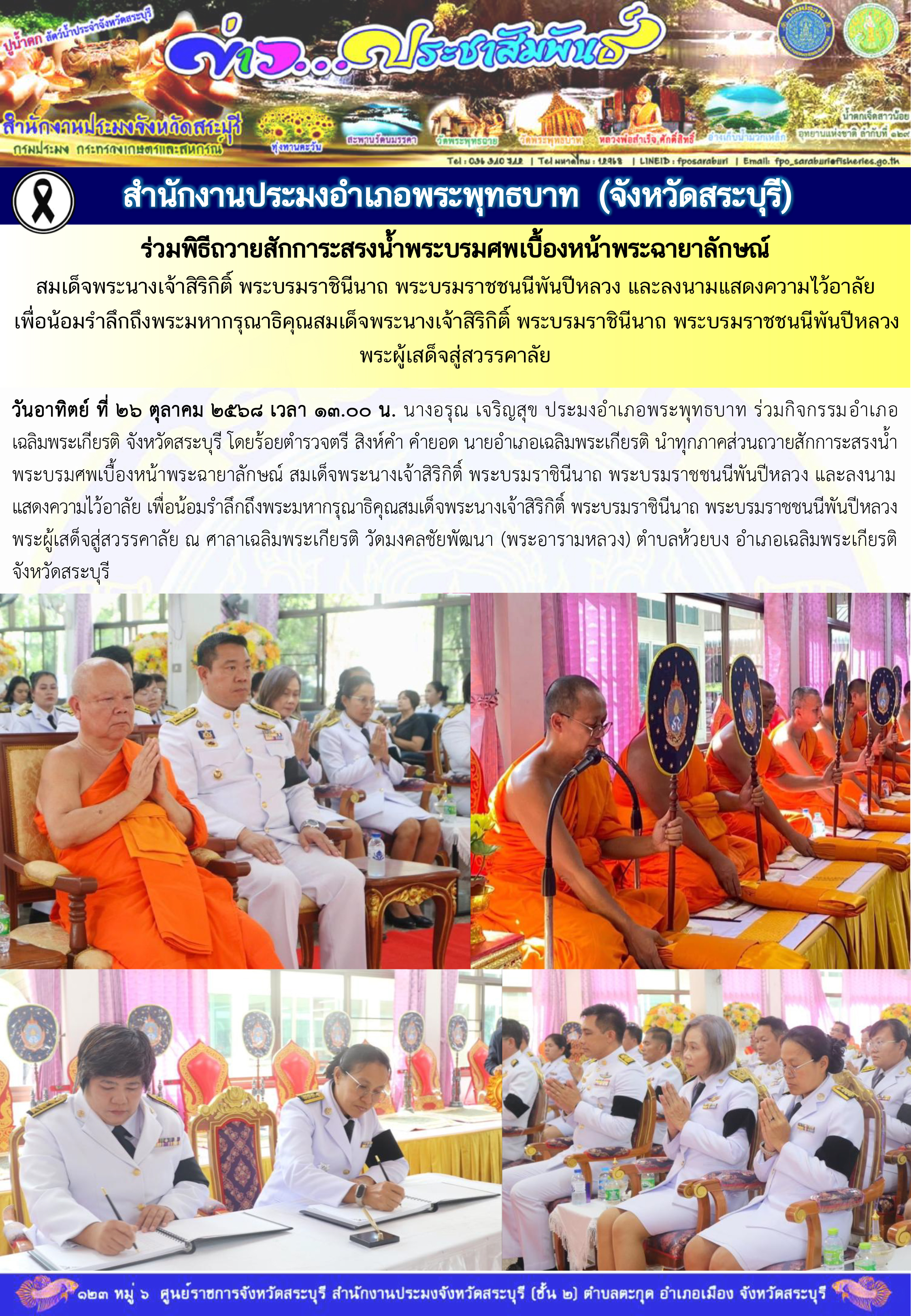 วันอาทิตย์ ที่ ๒๖ ตุลาคม ๒๕๖๘ เวลา ๐๙.๓๐ น. นางอรุณ เจริญสุข ประมงอำเภอพระพุทธบาท ร่วมกิจกรรมอำเภอพระพุทธบาท จังหวัดสระบุรี โดยนายมนัสพันธ์ ดอนก้อนไพร นายอำเภอพระพุทธบาท นำทุกภาคส่วนถวายสักการะสรงน้ำพระบรมศพเบื้องหน้าพระฉายาลักษณ์ สมเด็จพระนางเจ้าสิริกิติ์ พระบรมราชินีนาถ พระบรมราชชนนีพันปีหลวง และลงนามแสดงความไว้อาลัย เพื่อน้อมรำลึกถึงพระมหากรุณาธิคุณสมเด็จพระนางเจ้าสิริกิติ์ พระบรมราชินีนาถ พระบรมราชชนนีพันปีหลวง พระผู้เสด็จสู่สวรรคาลัย ณ ศาลาอบรมสงฆ์ วัดพระพุทธบาท ราชวรมหาวิหาร อำเภอพระพุทธบาท จังหวัดสระบุรี