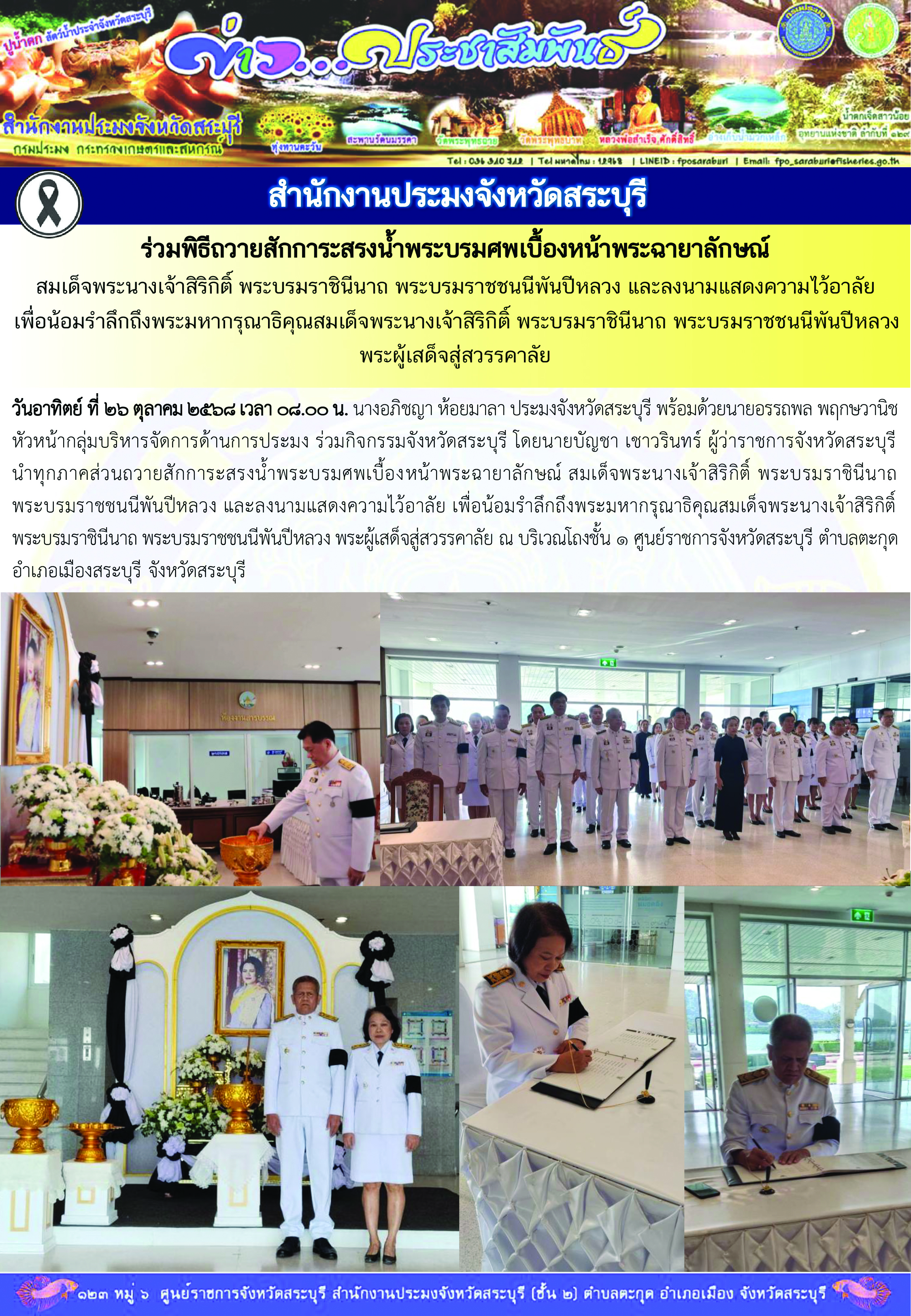 วันอาทิตย์ ที่ ๒๖ ตุลาคม ๒๕๖๘ เวลา ๐๘.๐๐ น. นางอภิชญา ห้อยมาลา ประมงจังหวัดสระบุรี พร้อมด้วยนายอรรถพล พฤกษวานิช หัวหน้ากลุ่มบริหารจัดการด้านการประมง ร่วมกิจกรรมจังหวัดสระบุรี โดยนายบัญชา เชาวรินทร์ ผู้ว่าราชการจังหวัดสระบุรี นำทุกภาคส่วนถวายสักการะสรงน้ำพระบรมศพเบื้องหน้าพระฉายาลักษณ์ สมเด็จพระนางเจ้าสิริกิติ์ พระบรมราชินีนาถ พระบรมราชชนนีพันปีหลวง และลงนามแสดงความไว้อาลัย เพื่อน้อมรำลึกถึงพระมหากรุณาธิคุณสมเด็จพระนางเจ้าสิริกิติ์ พระบรมราชินีนาถ พระบรมราชชนนีพันปีหลวง พระผู้เสด็จสู่สวรรคาลัย ณ บริเวณโถงชั้น ๑ ศูนย์ราชการจังหวัดสระบุรี ตำบลตะกุด อำเภอเมืองสระบุรี จังหวัดสระบุรี