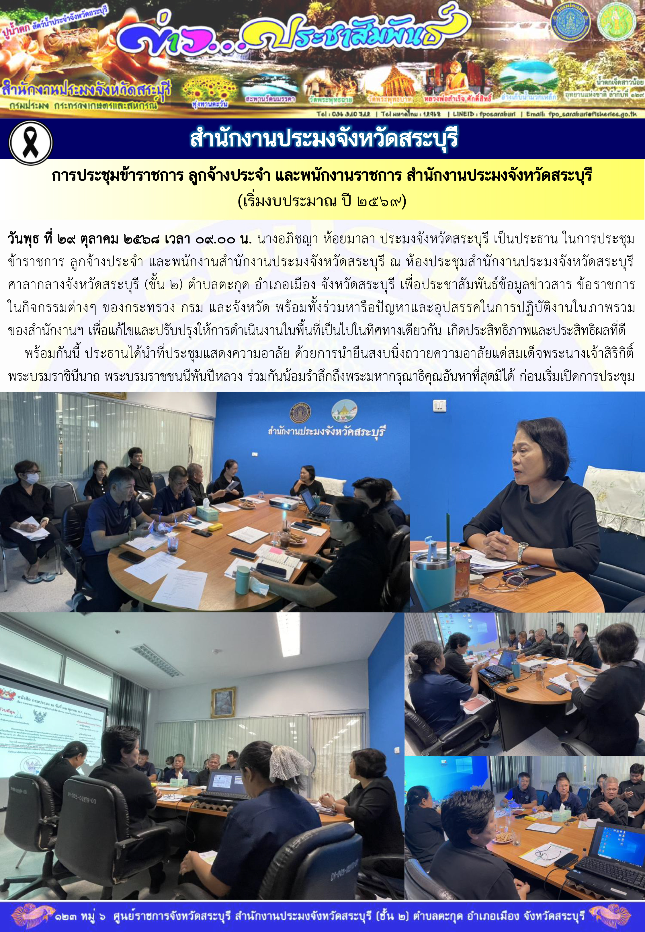 วันพุธ ที่ ๒๙ ตุลาคม ๒๕๖๘ เวลา ๐๙.๐๐ น. นางอภิชญา ห้อยมาลา ประมงจังหวัดสระบุรี เป็นประธาน ในการประชุมข้าราชการ ลูกจ้างประจำ และพนักงานสำนักงานประมงจังหวัดสระบุรี ณ ห้องประชุมสำนักงานประมงจังหวัดสระบุรี ศาลากลางจังหวัดสระบุรี (ชั้น ๒) ตำบลตะกุด อำเภอเมือง จังหวัดสระบุรี เพื่อประชาสัมพันธ์ข้อมูลข่าวสาร ข้อราชการในกิจกรรมต่างๆ ของกระทรวง กรม และจังหวัด พร้อมทั้งร่วมหารือปัญหาและอุปสรรคในการปฏิบัติงานในภาพรวมของสำนักงานฯ เพื่อแก้ไขและปรับปรุงให้การดำเนินงานในพื้นที่เป็นไปในทิศทางเดียวกัน เกิดประสิทธิภาพและประสิทธิผลที่ดี